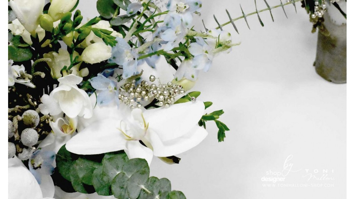 Aranjamentele florale pentru cristelniță realizate de Toni Malloni Shop sunt compuse din 5 piese florale individuale, gândite special pentru a îmbrăca armonios vasul de botez. Fiecare buchet este prevăzut cu un sistem discret de prindere cu cârlig, astfel încât montajul să fie extrem de simplu și rapid, fără a necesita cunoștințe tehnice sau accesorii suplimentare.