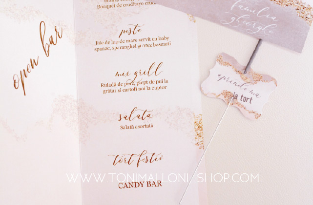 DESIGN UNIC - PRODUSE CUSTOMIZATE  - Tot experienta ne spune ca fiecare client sau eveniment are particularitatile lui, asadar, daca nu gasiti produsul dorit online, scrieti-ne un mail ( shop@tonimalloni-shop.com ) sau pe chat sau pe whatsup la numarul 0723 701 348 , unde va simtiti mai liberi si mai confortabili si impreuna, cu siguranta vom concepe si produce produsele sau serviciile dorite.