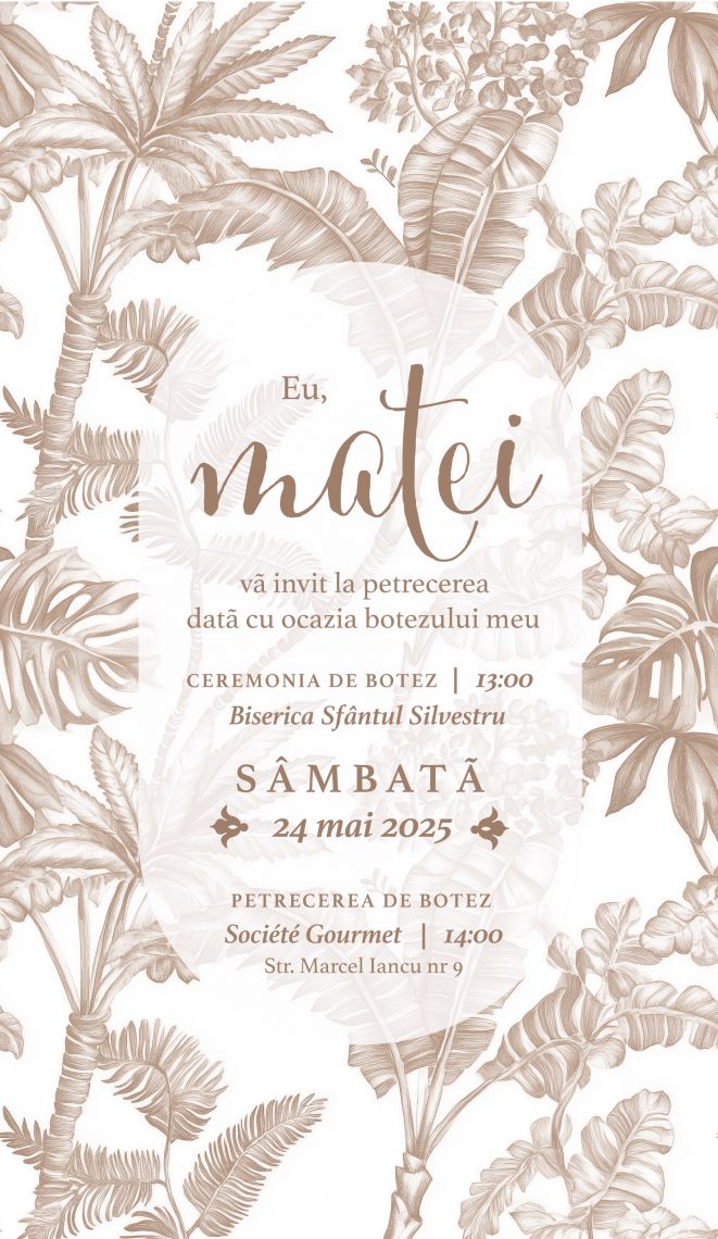 Această invitație digitală botez băiat aduce un aer jucăuș și elegant în același timp, decorată cu animale junglă și frunze delicate în nuanțe light cream. Este ideală pentru un botez băiat cu tematică safari modern, combinând designul minimalist cu elemente naturale și atractive.