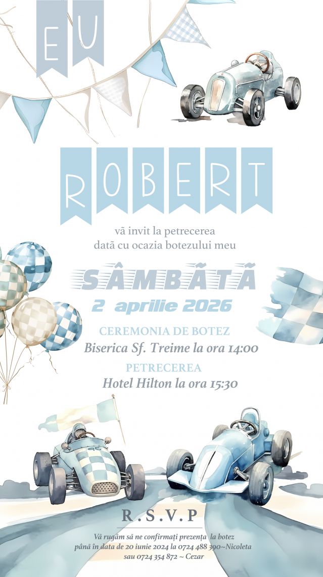 O invitație digitală botez băiețel jucăușă și energică, cu mașinuțe de curse Formula 1, în nuanțe vii, însoțită de elemente grafice sportive și detalii de aventură. Această invitație electronică combină dinamismul și atmosfera veselă, creând un design atrăgător și primitor pentru invitați.