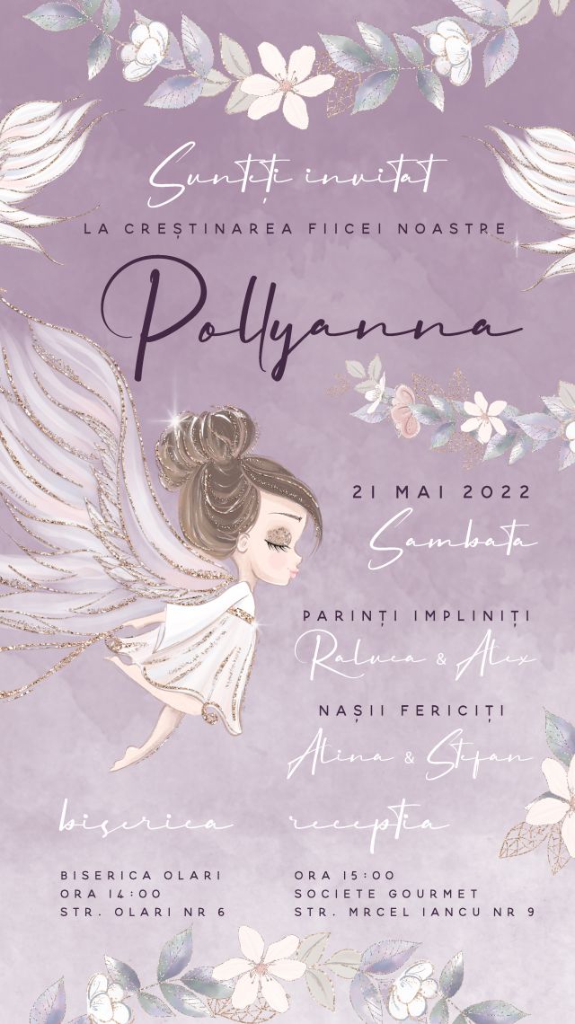 Invitație digitală botez fetiță – Înger mov