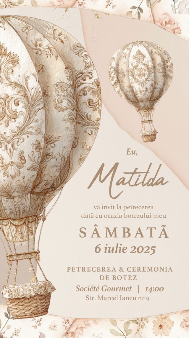 O invitație digitală botez fetiță elegantă și rafinată, inspirată din universul vintage al baloanelor cu aer cald, în nuanțe nude, crem, bej și maro.