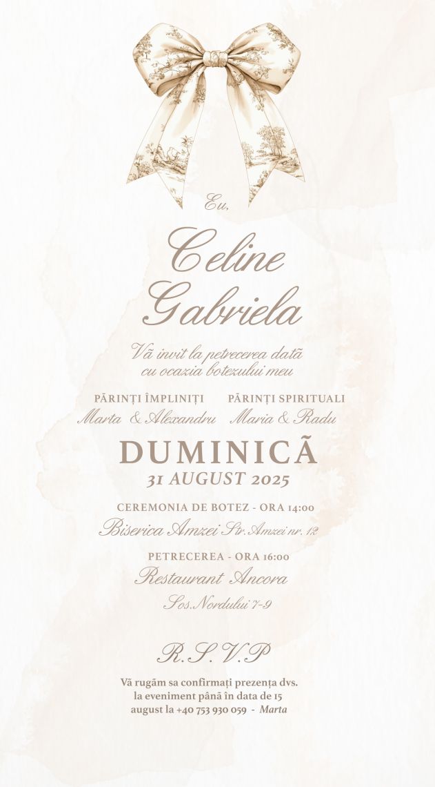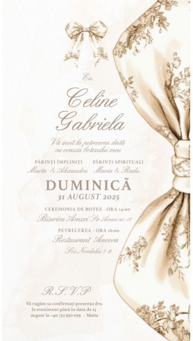 Încântă invitații cu un design simplu și elegant prin Invitația Digitală de Botez „Simple Elegance”, un model rafinat pentru fetițe, în nuanțe crem și bej. Fundița delicată adaugă un detaliu subtil și feminin, păstrând invitația discretă și sofisticată.