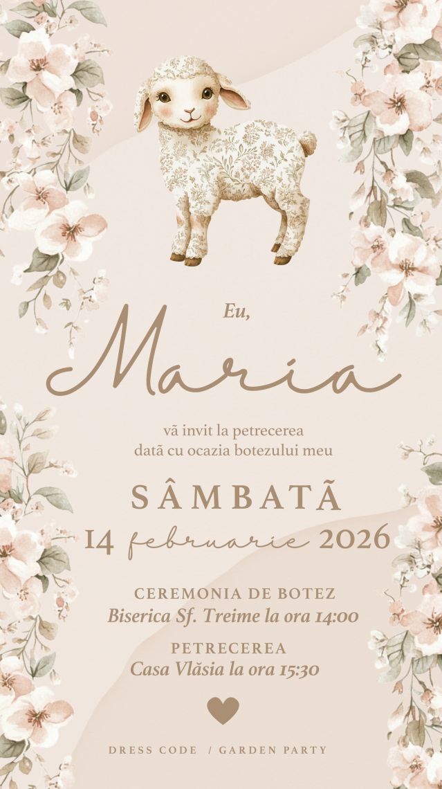 Această invitație electronică combină inocența și gingășia unui design jucăuș cu eleganța potrivită pentru un botez memorabil, creând o atmosferă caldă și primitoare pentru invitați.
