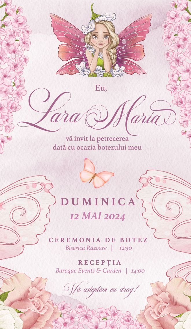 Invitație digitală botez fetiță – Flori roz și spiriduș zână