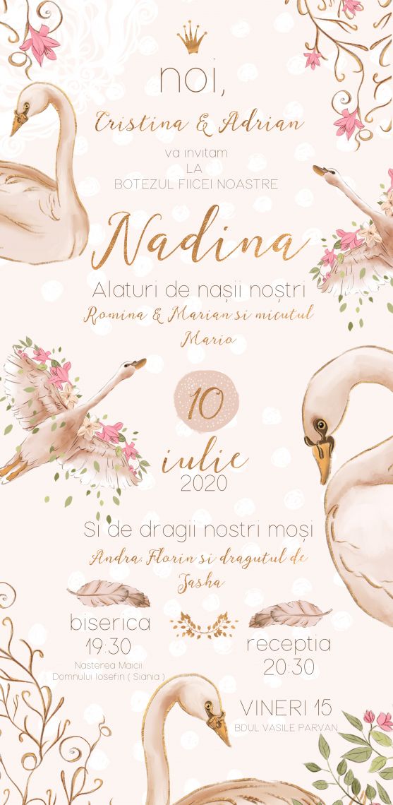 O invitație electronică de botez fetiță elegantă, decorată cu lebede delicate și accente aurii sofisticate, perfectă pentru un botez plin de rafinament și stil. Această invitație digitală botez fetiță este ideală pentru părinții care doresc un design modern, dar clasic în același timp.