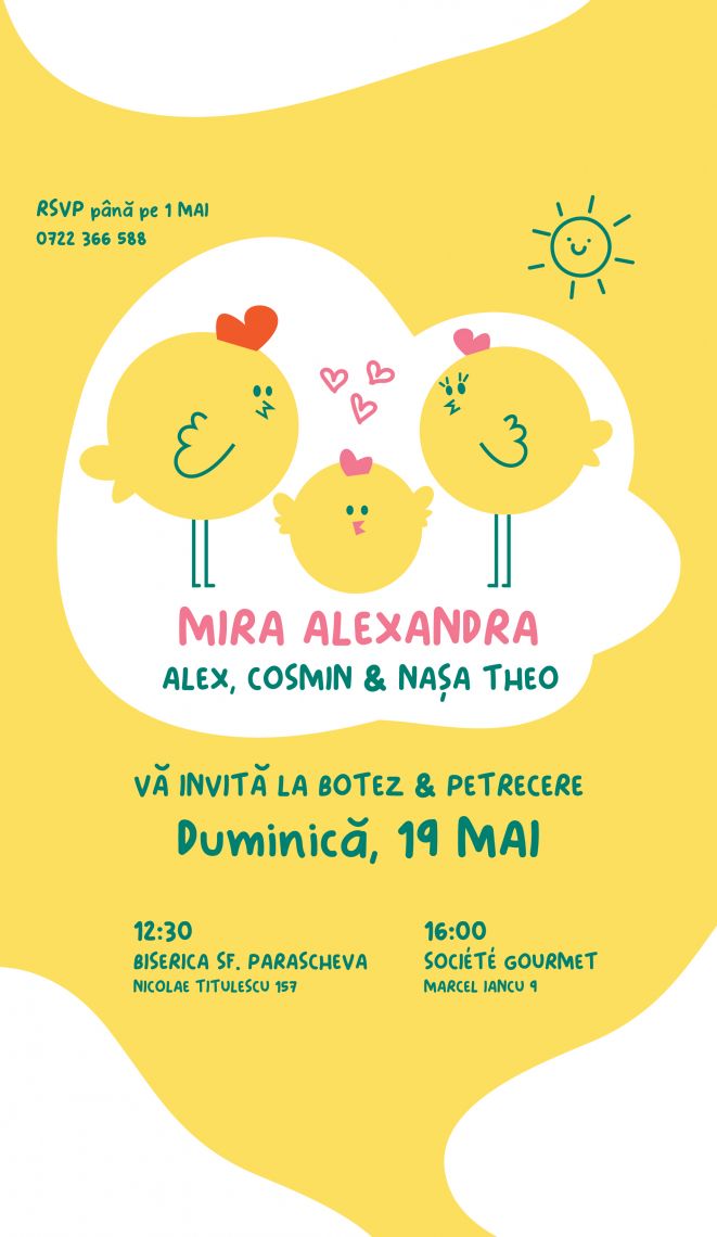 O invitație digitală botez fetiță drăgălașă și jucăușă, decorată cu puiuți de găină, perfectă pentru un botez fetiță vesel și plin de gingășie. Această invitație electronică pentru botez fetiță combină elemente naturale și simpatice, creând o atmosferă caldă și primitoare pentru invitați.