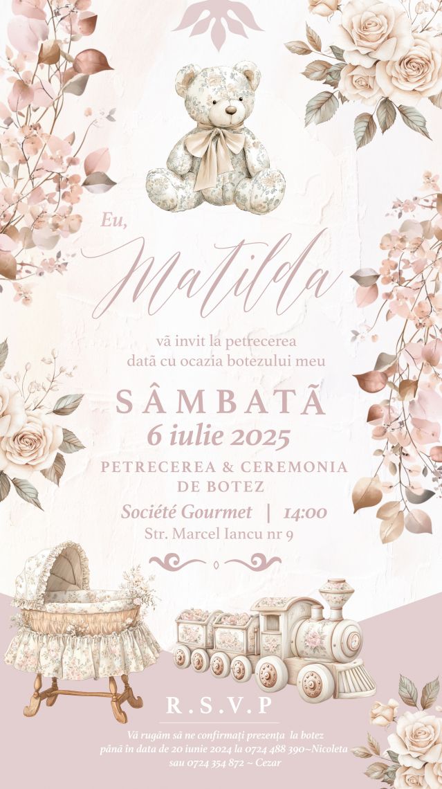 O invitație digitală botez fetiță delicată și adorabilă, cu un ursuleț vintage în nuanțe de roz pudră și bej, însoțit de flori și jucării din lemn, precum trenuț și patut de bebe. Această invitație electronică pentru botez combină gingășia și nostalgicul unui design vintage cu elemente jucăușe, creând o atmosferă caldă și primitoare pentru invitați.
