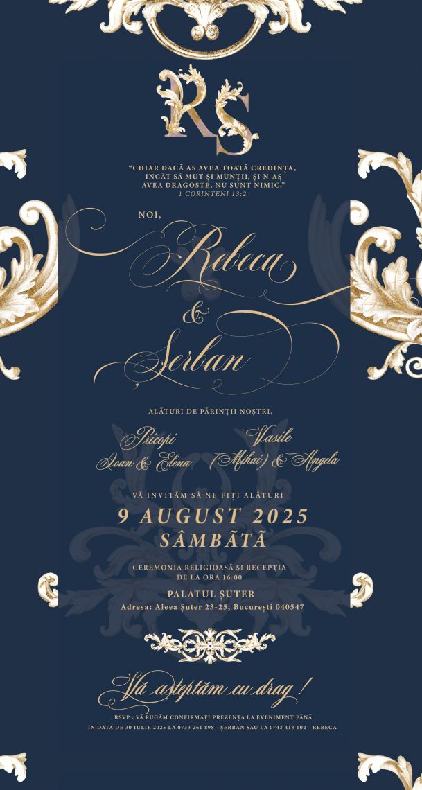 Încântă invitații cu o atmosferă regală prin Invitația Digitală de Nuntă „Royal Elegance”, un model sofisticat, inspirat din eleganța barocă, cu detalii aurii pe fundal bleumarin și font crem scris de mână. Această invitație digitală transmite lux, rafinament și un aer clasic, perfect pentru o nuntă de poveste la palat.