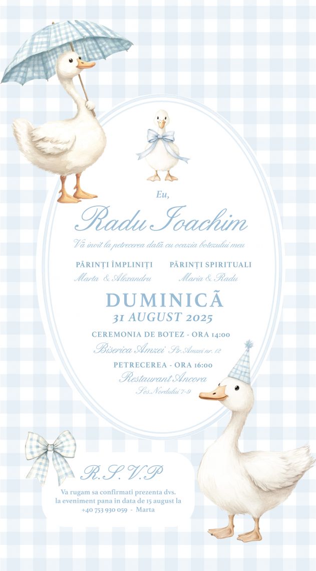 O invitație digitală adorabilă, cu model în carouri delicate și accente în tonuri blânde de bleu și crem, inspirată din vesela gașcă Silly Goose – perfectă pentru un botez elegant, dar plin de bucurie.