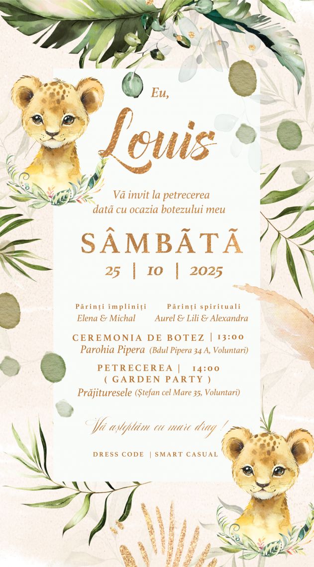O invitație digitală plină de farmec, inspirată din celebra animație Lion King, cu un design cald și jucăuș în nuanțe naturale de bej, caramel,verde natur și auriu.