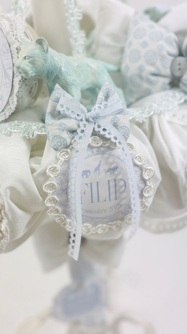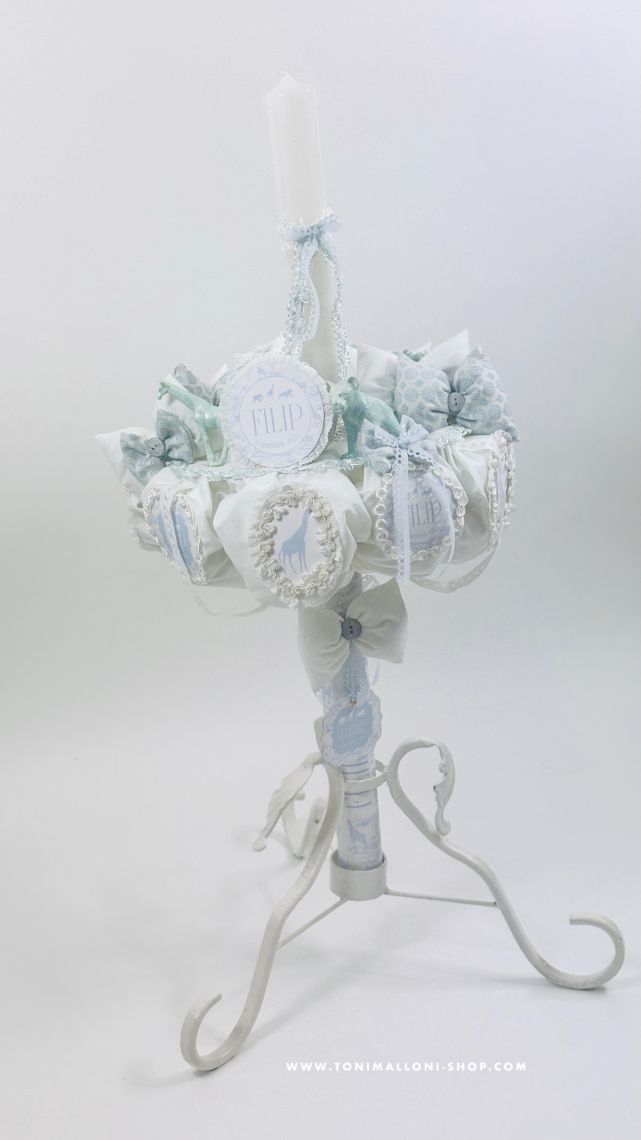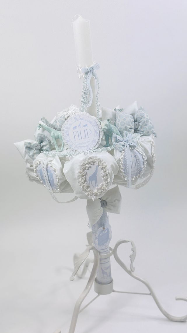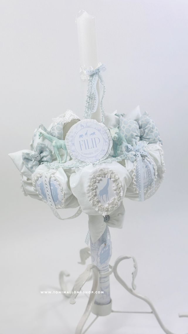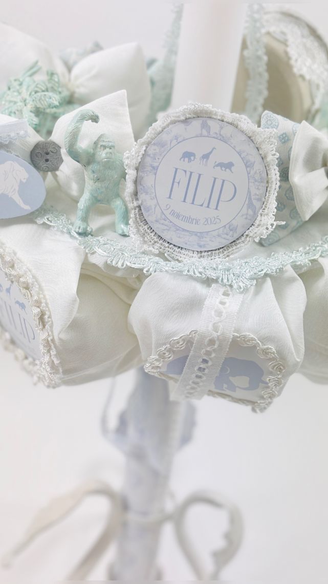 Lumânarea de botez pentru băieți „Blue Animals Safari Dream” este realizată într-un design elegant, în nuanțe de alb cu accente bleu, decorată cu figurine de animale exotice și detalii brodate personalizate cu numele și data botezului. Aranjamentul este realizat manual cu atenție la fiecare detaliu, conferind rafinament și unicitate momentului special. Materialele de calitate, broderiile fine și accesoriile tematice transformă această lumânare într-o piesă centrală deosebită pentru ceremonia de botez.
