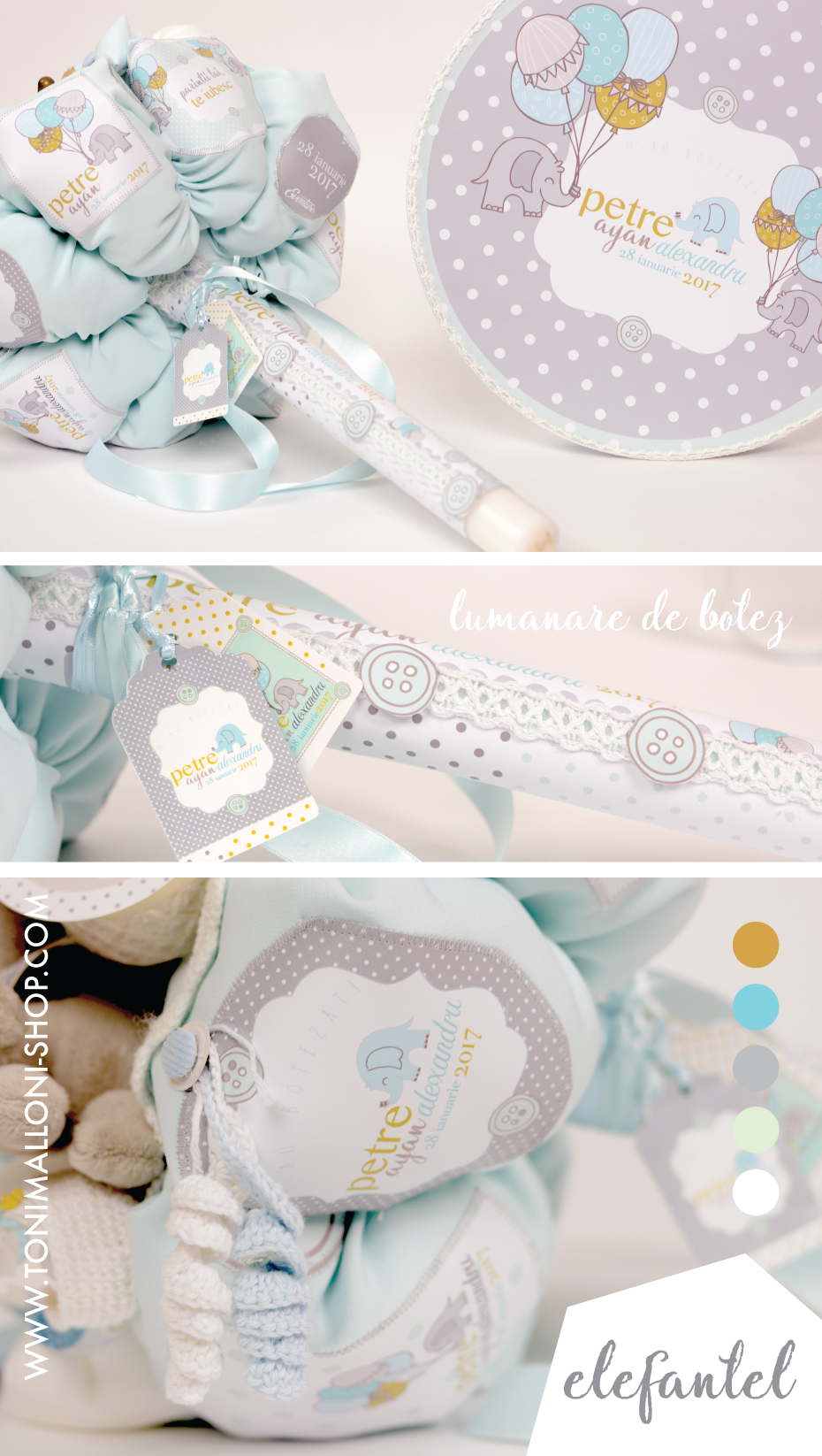 Am fi incantati sa comandati si trusoul de botez alb cu elefanti brodat computerizat cu numele bebeului sau restul decoratiunilor pentru botez marca Toni Malloni Design.