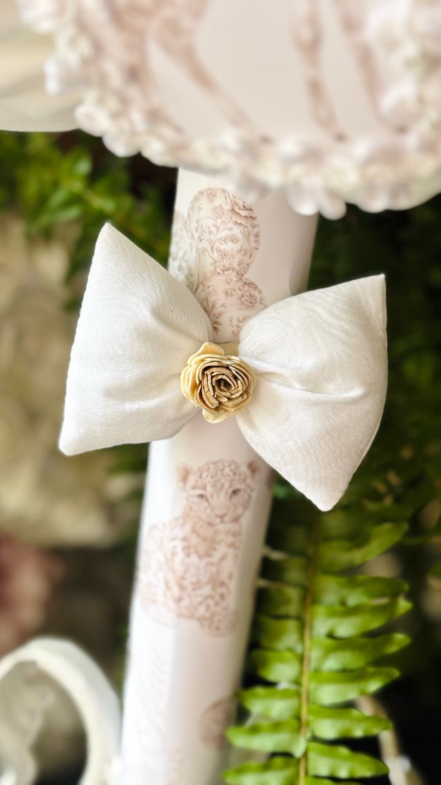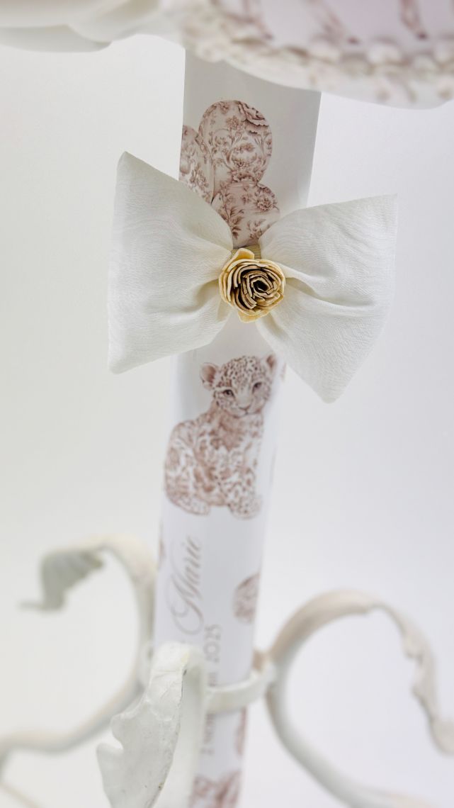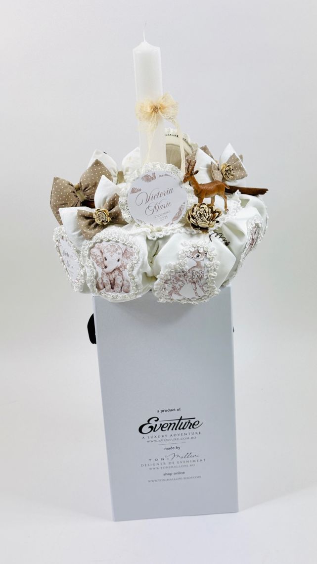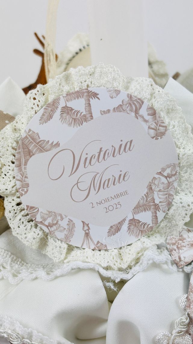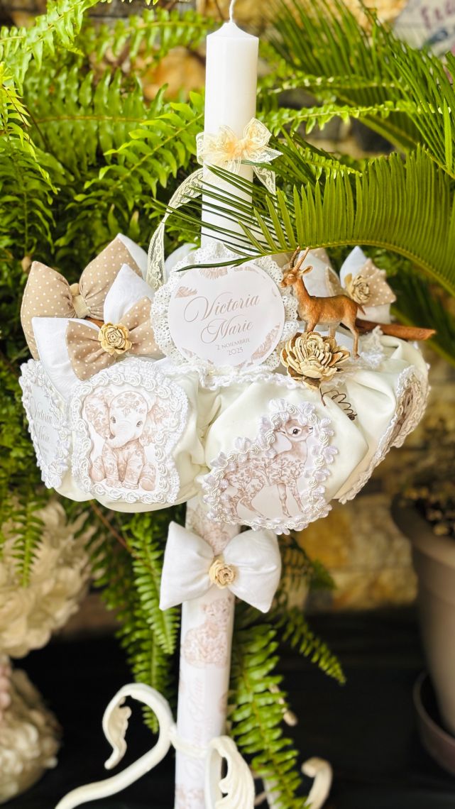 Lumânarea este personalizabilă cu numele copilului și data botezului, iar la cerere poate fi accesorizată cu flori naturale, inclusiv orhidee albe, pentru un efect și mai spectaculos.