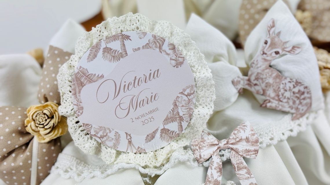 Accesorii: cutii personalizate, prosoape, body-uri brodate, pânză de mir, panglici din materiale fine, decoruri florale tematice.
