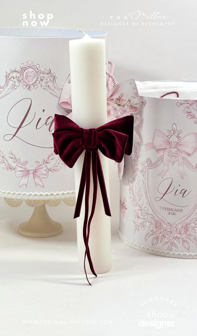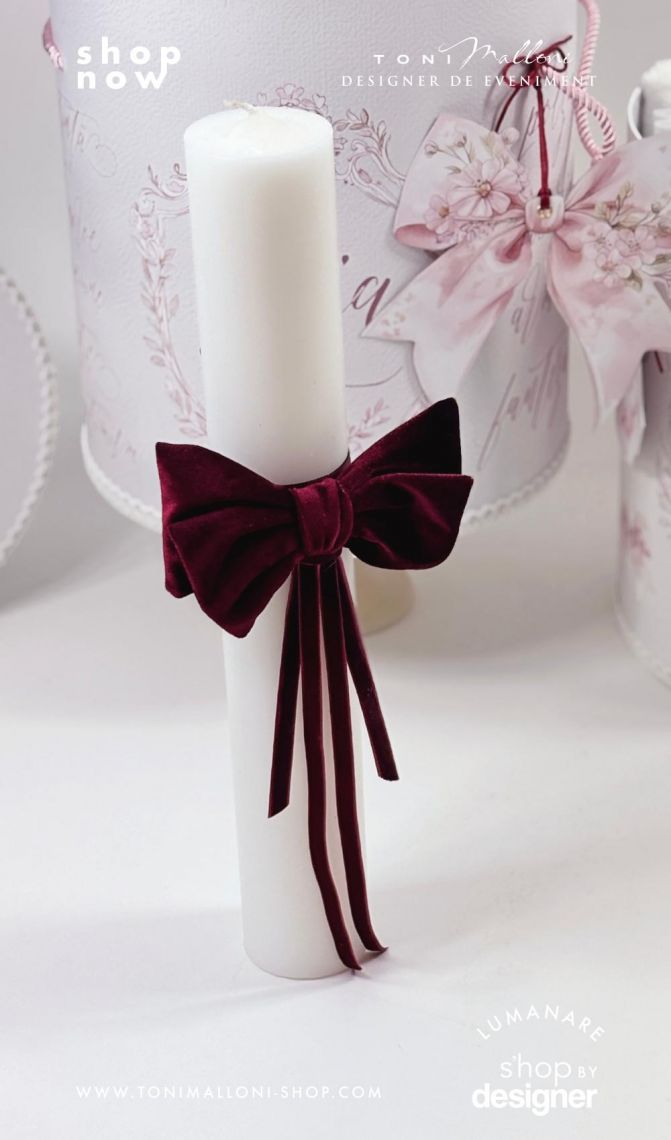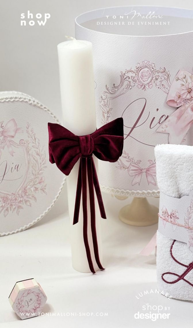 Lumânarea de botez stâlp alb 40x8 cm „Pink Bow” este un model feminin, elegant și modern, realizat cu atenție la detalii și o estetică rafinată. Fundița din catifea burgundy/grena adaugă un contrast sofisticat și un aer de lux, transformând lumânarea într-un accesoriu perfect pentru ceremonia de botez. Recomandăm această lumânare să fie comandată împreună cu trusoul Pink Bow pentru un set armonios și complet, care să impresioneze prin eleganță și stil.