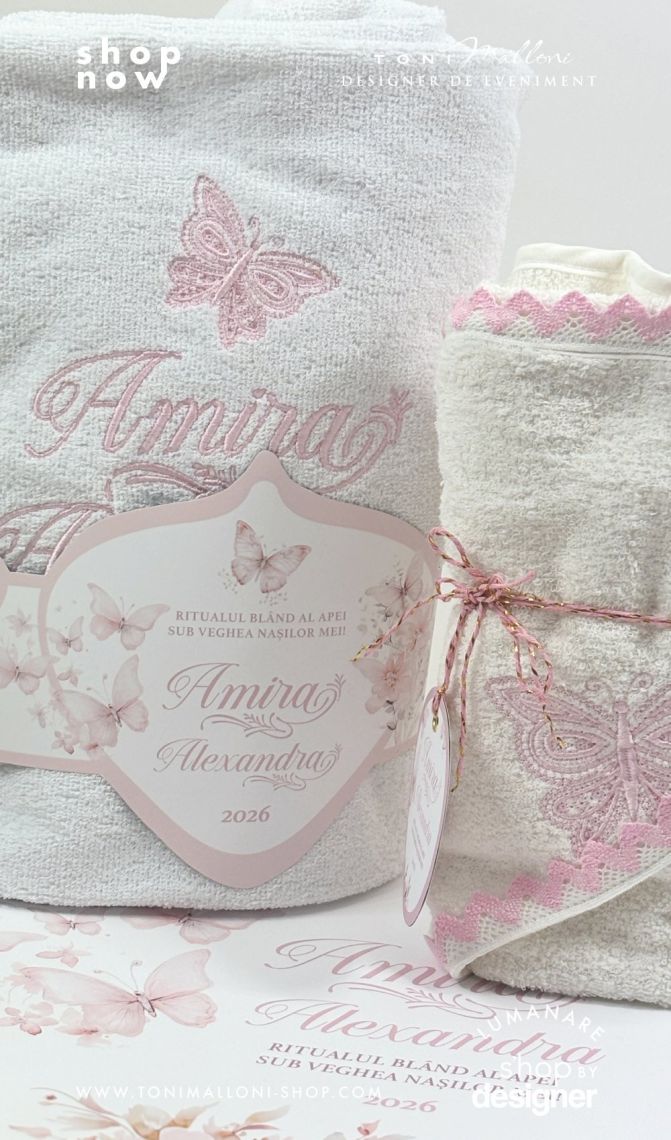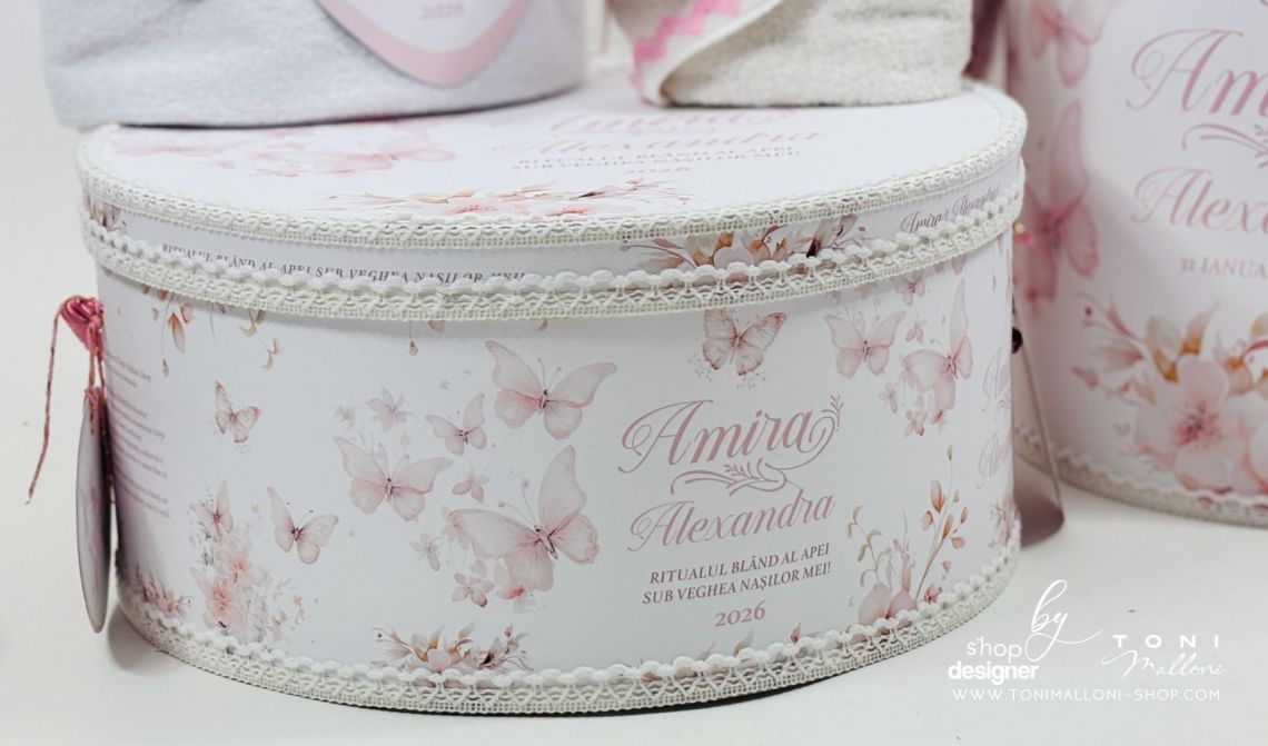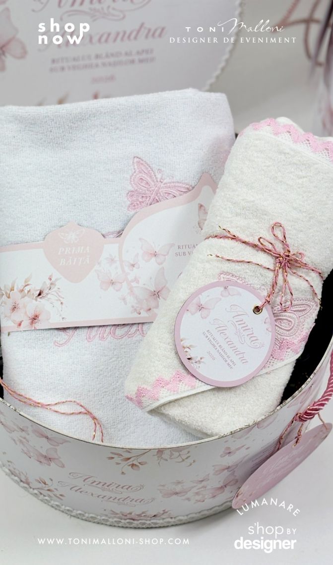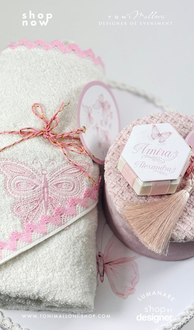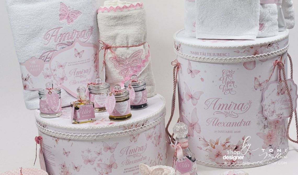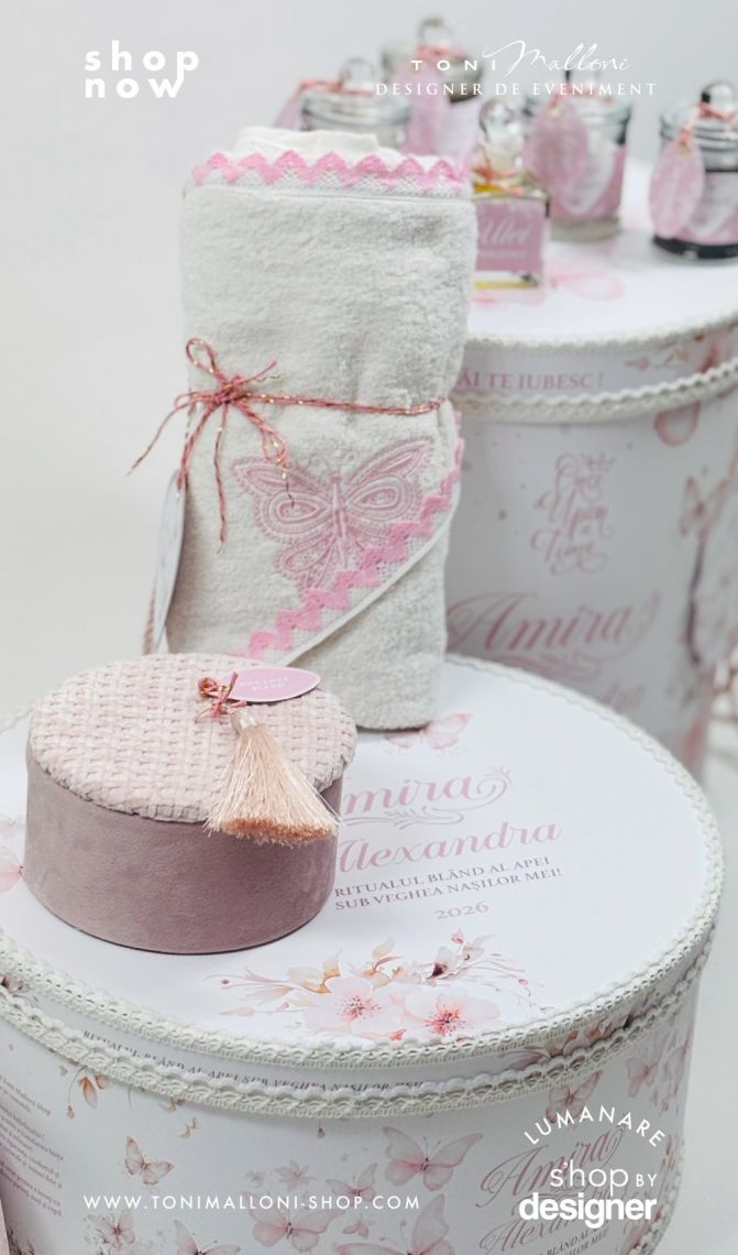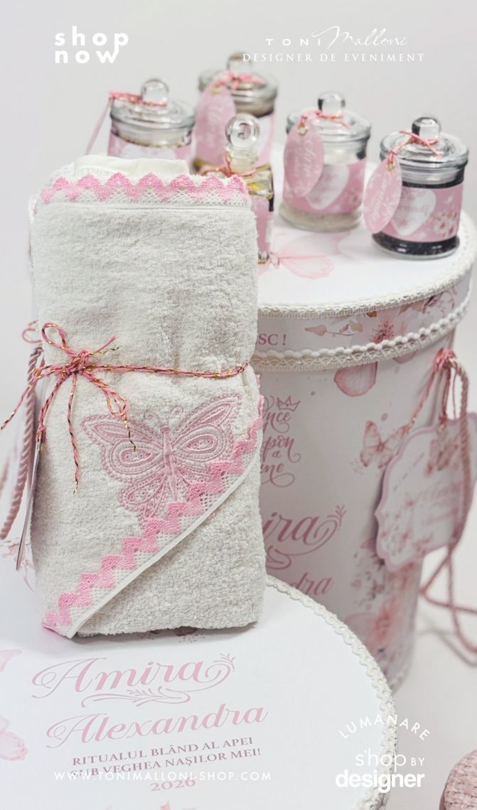 Inspirat de fluturi diafani, nuanțe de roz pudră și tonuri calde, acest set evocă puritatea, transformarea și frumusețea începuturilor. Fiecare element este ales cu atenție pentru a crea o experiență senzorială delicată, în care apa, aromele și gesturile se împletesc într-un moment de liniște și iubire, sub veghea nașilor.