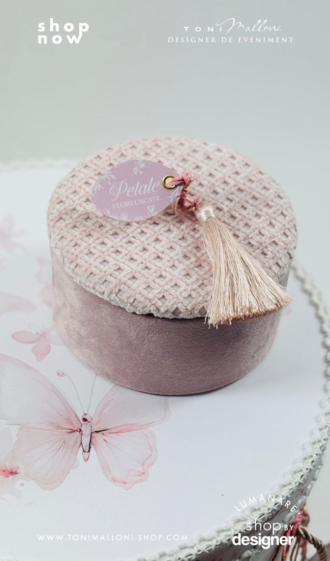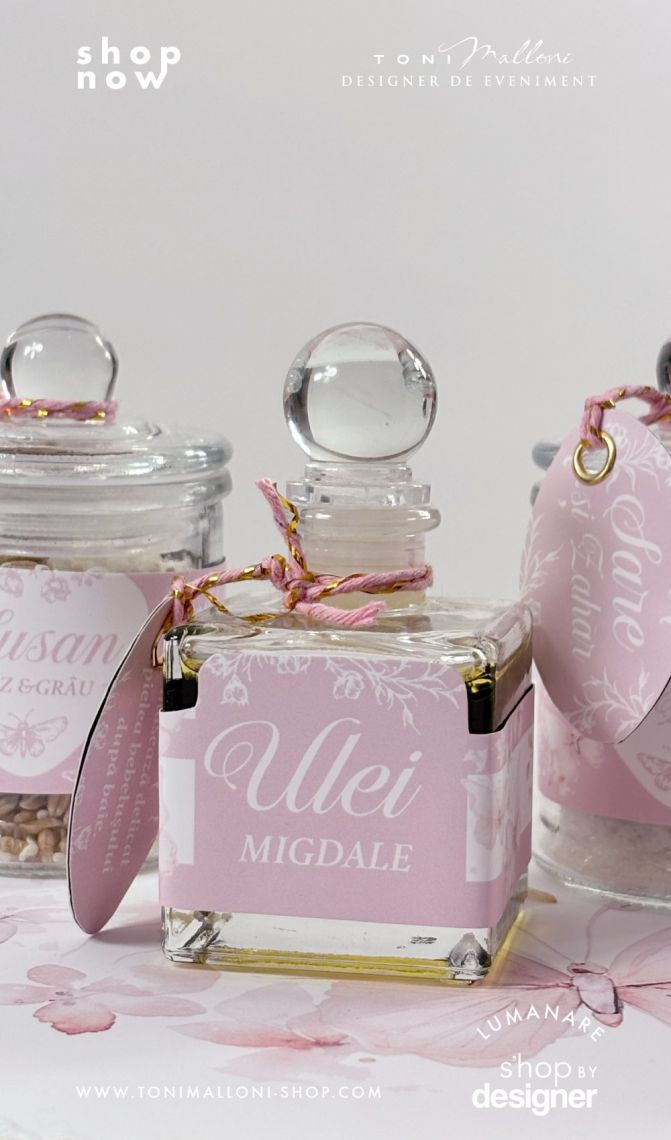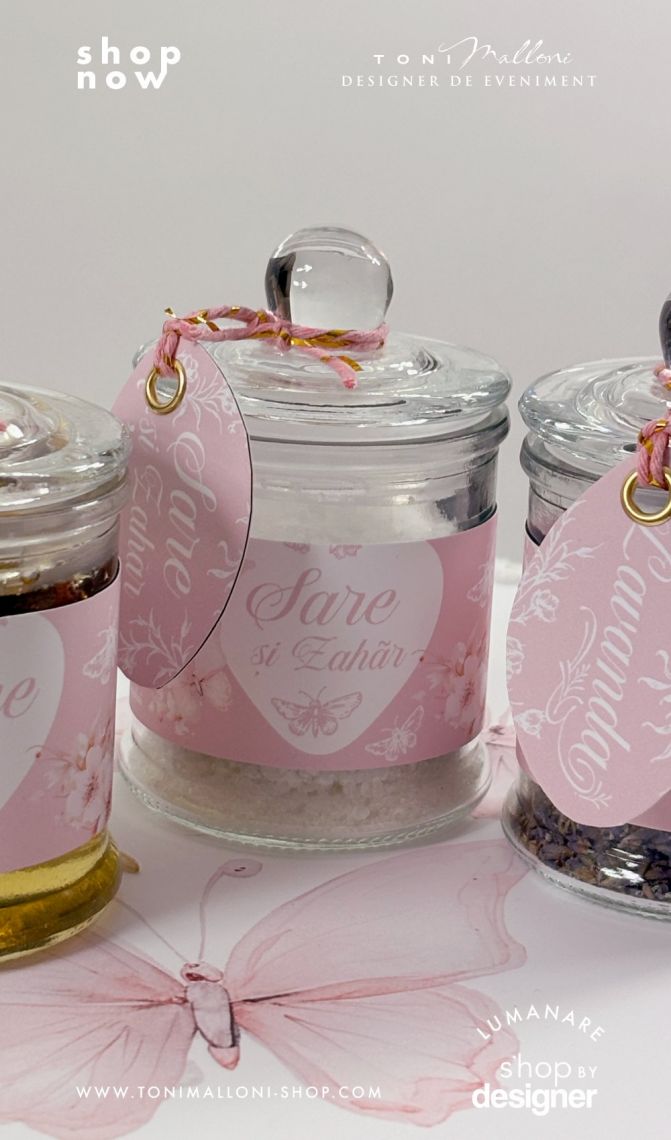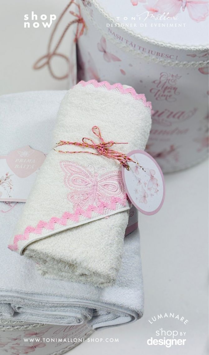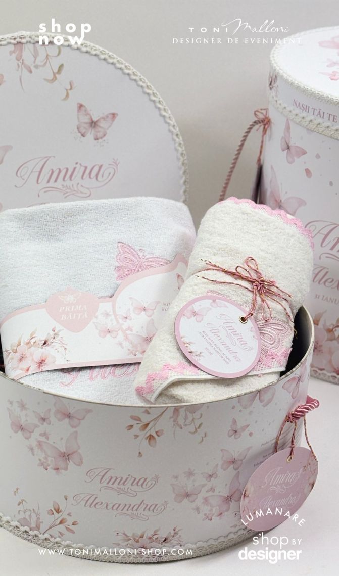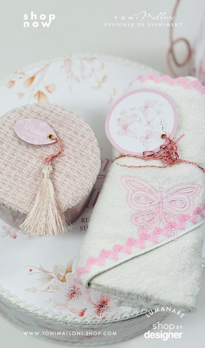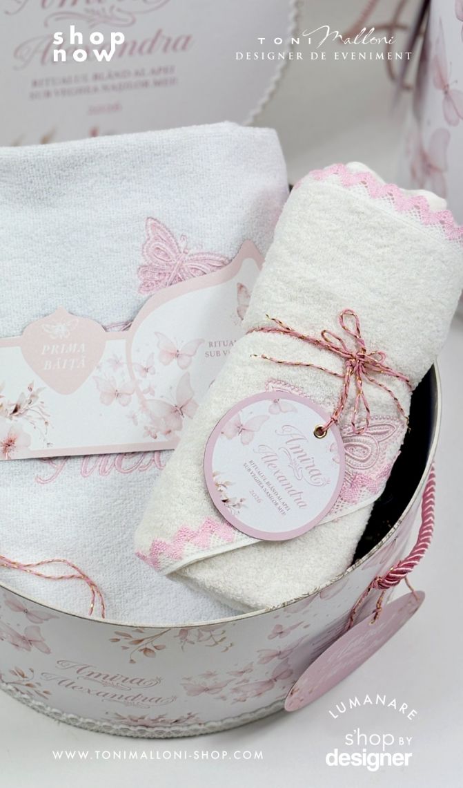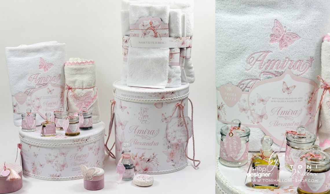 Inspirat de fluturi diafani, nuanțe de roz pudră și tonuri calde, acest set evocă puritatea, transformarea și frumusețea începuturilor. Fiecare element este ales cu atenție pentru a crea o experiență senzorială delicată, în care apa, aromele și gesturile se împletesc într-un moment de liniște și iubire, sub veghea nașilor.
