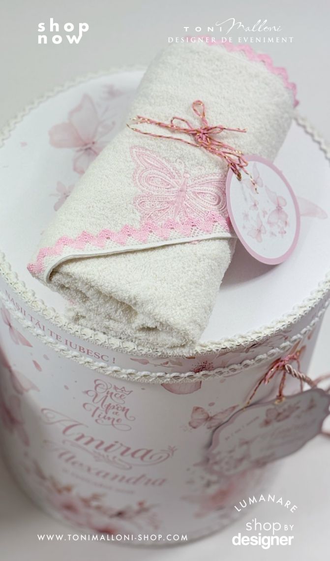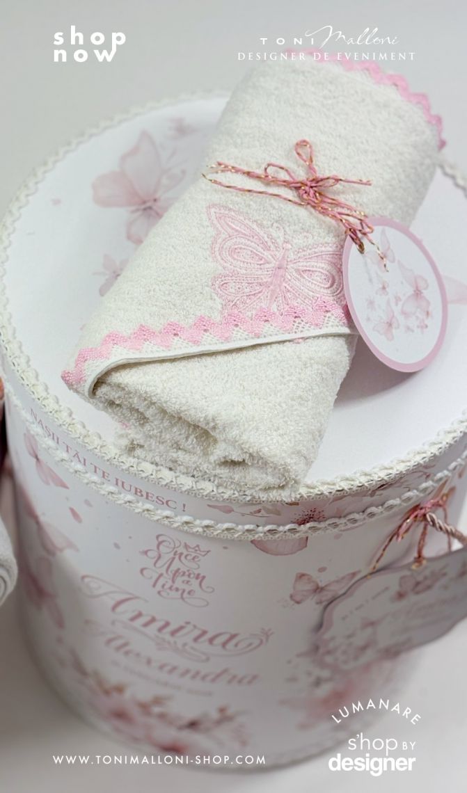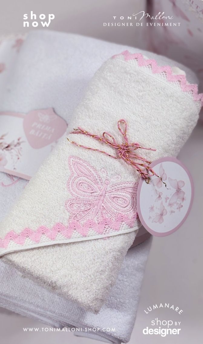 Perfect pentru uscarea delicată și confortul bebelușului după băiță, cu broderie personalizată cu fluturi și pattern feminin.