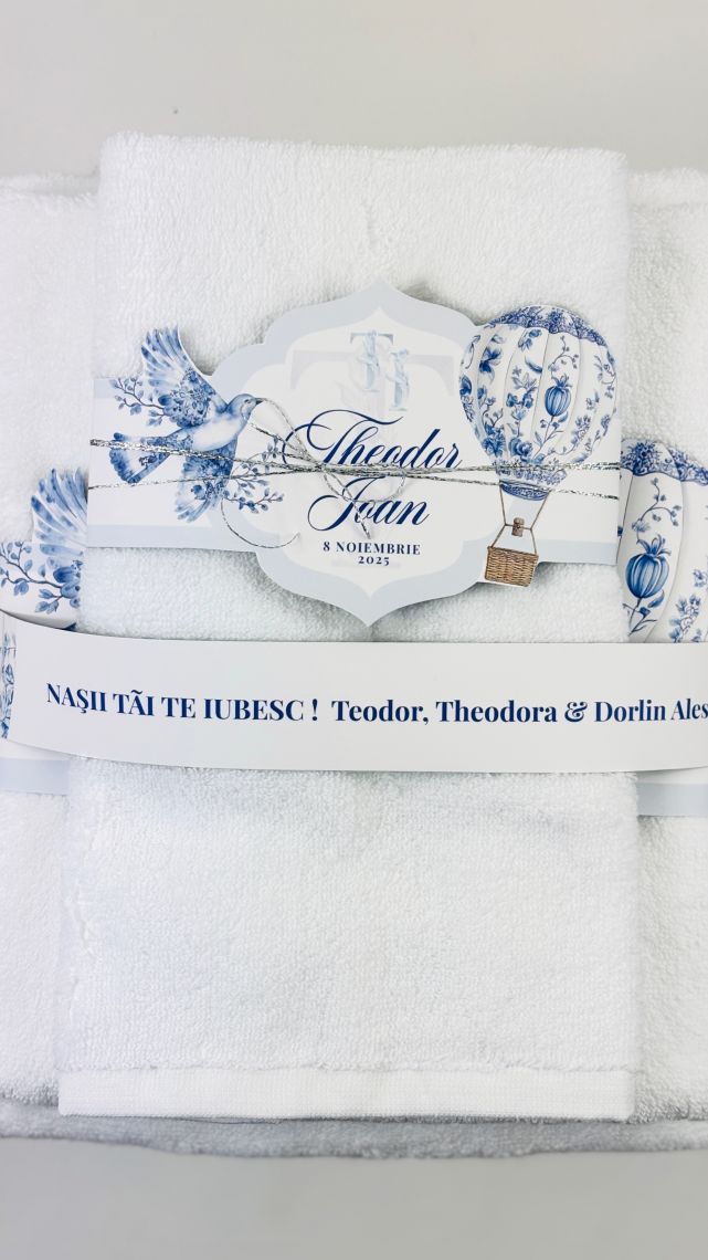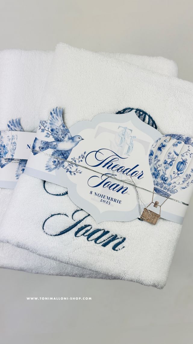 Culorile albastre si crem, combinate cu detaliile brodate atent, fac din acest trusou un cadou memorabil si unic.