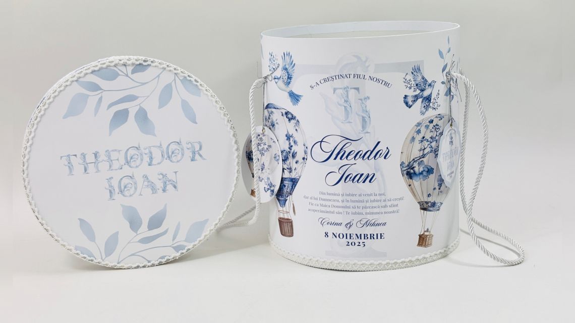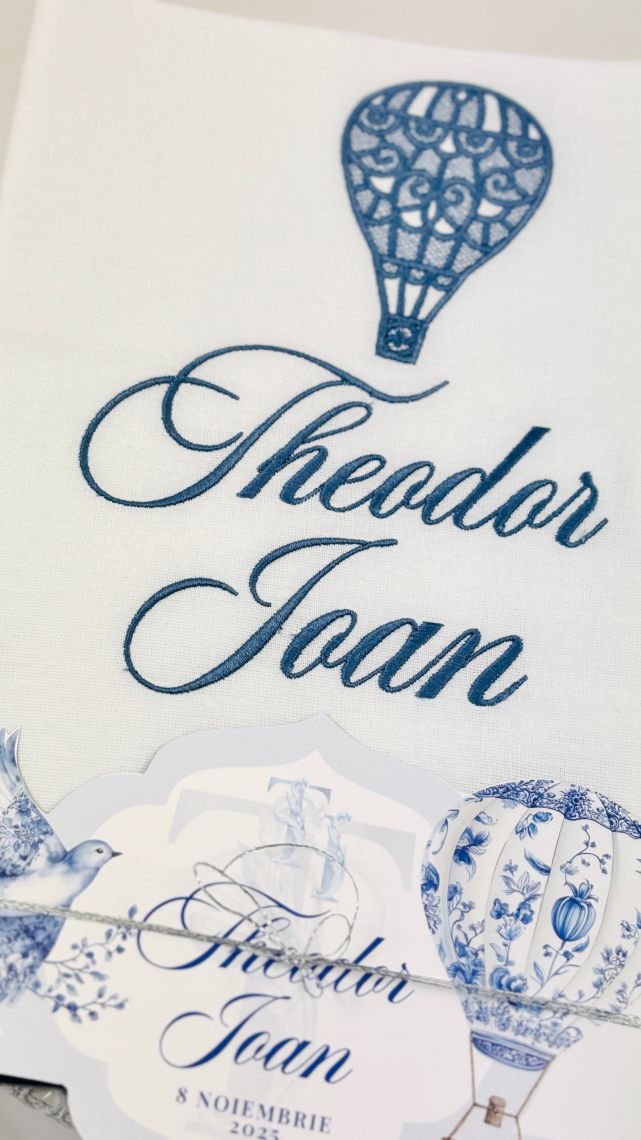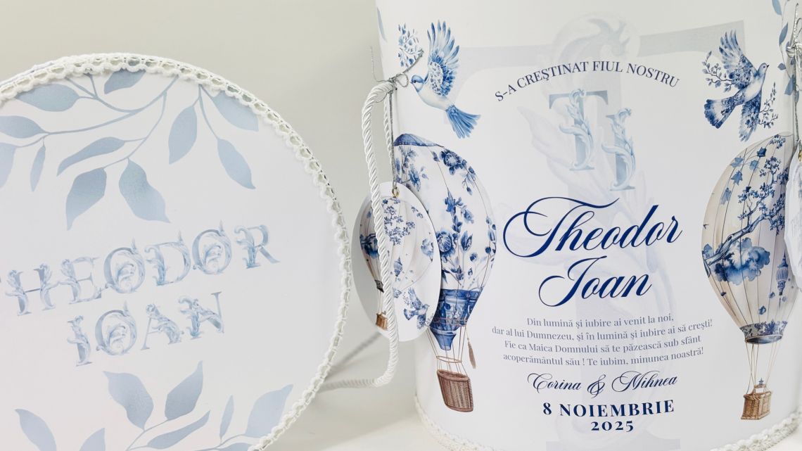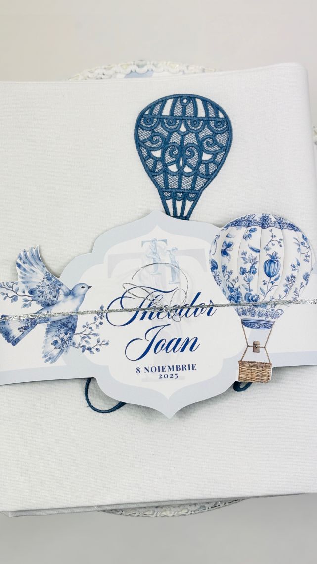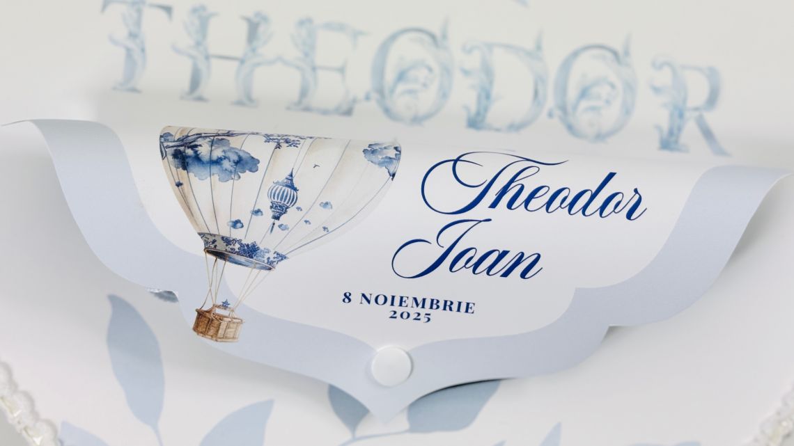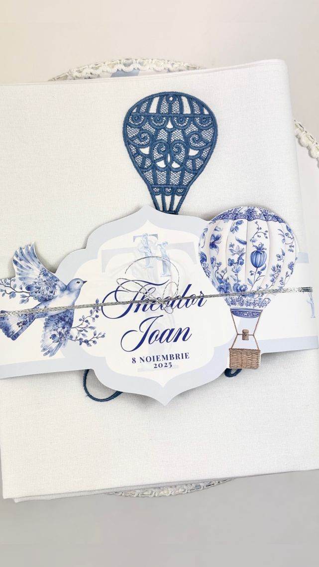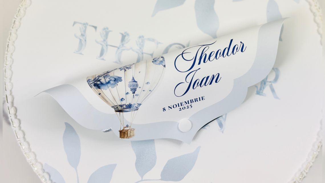 Designul cu baloane de aer cald intr-un pattern blue toile si font elegant creeaza o atmosfera sofisticata si jucausa in acelasi timp.