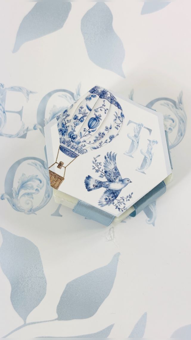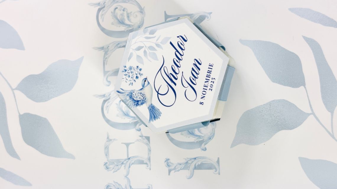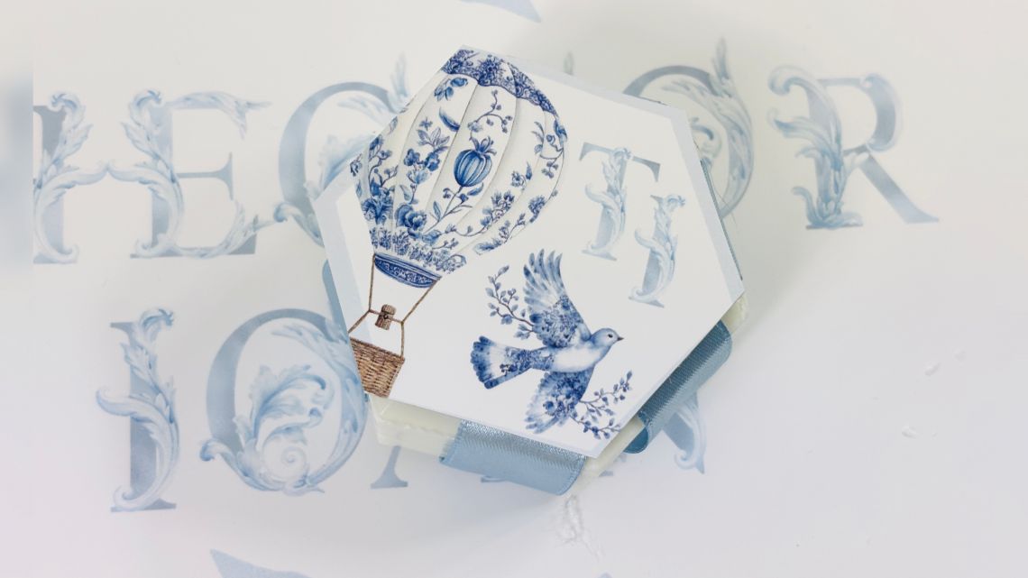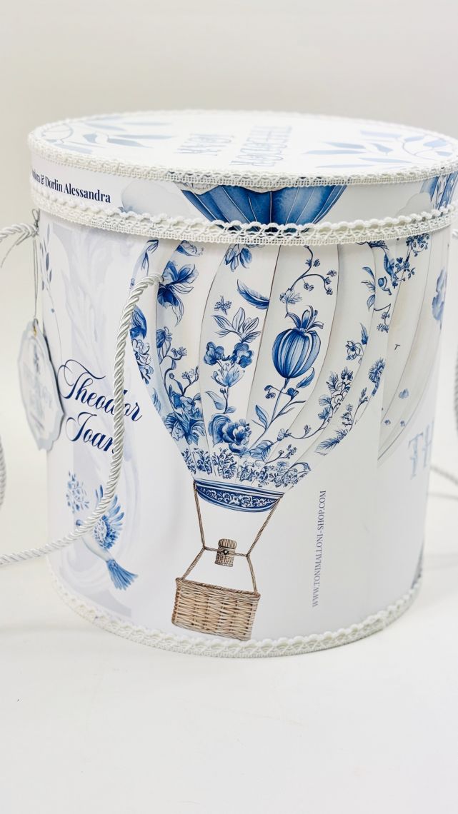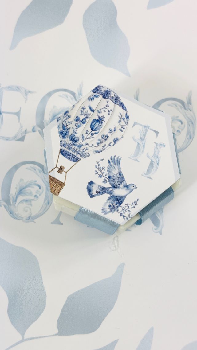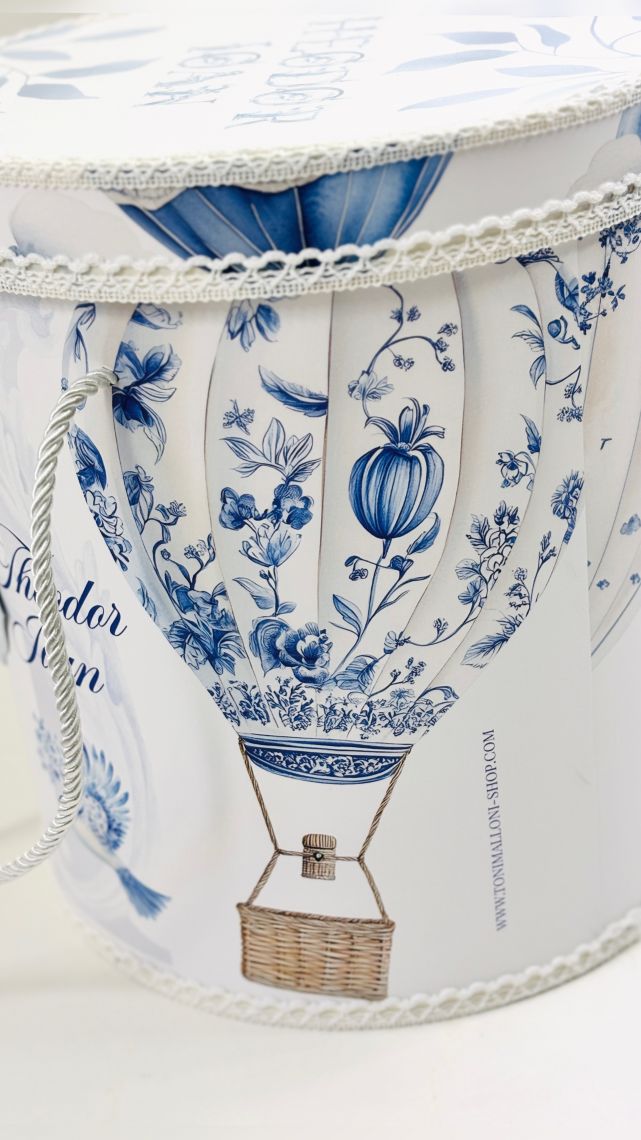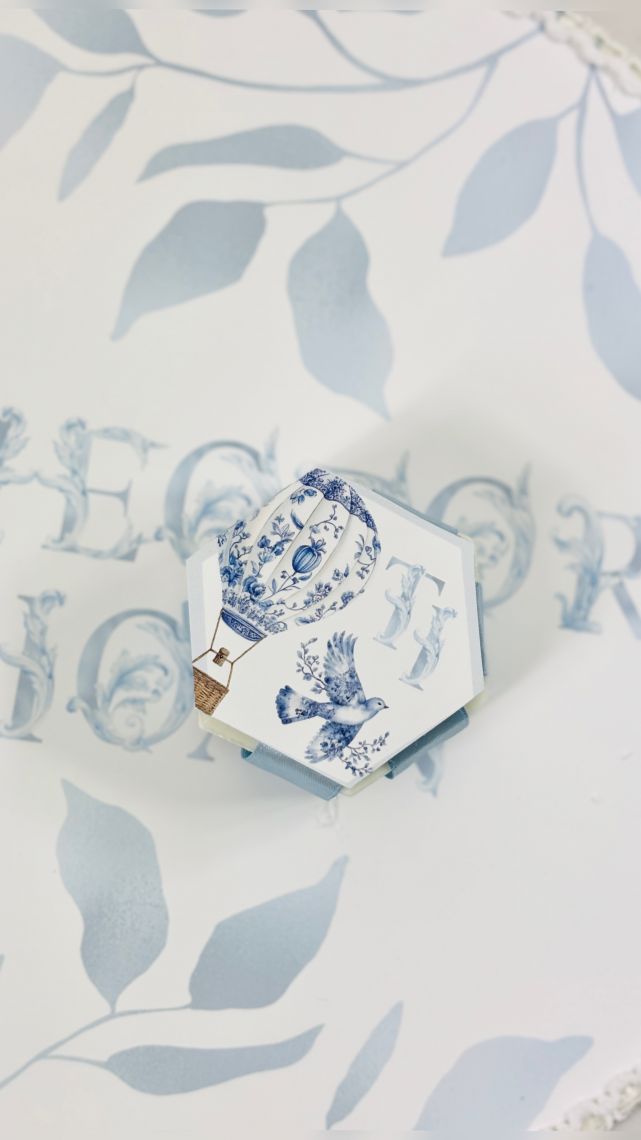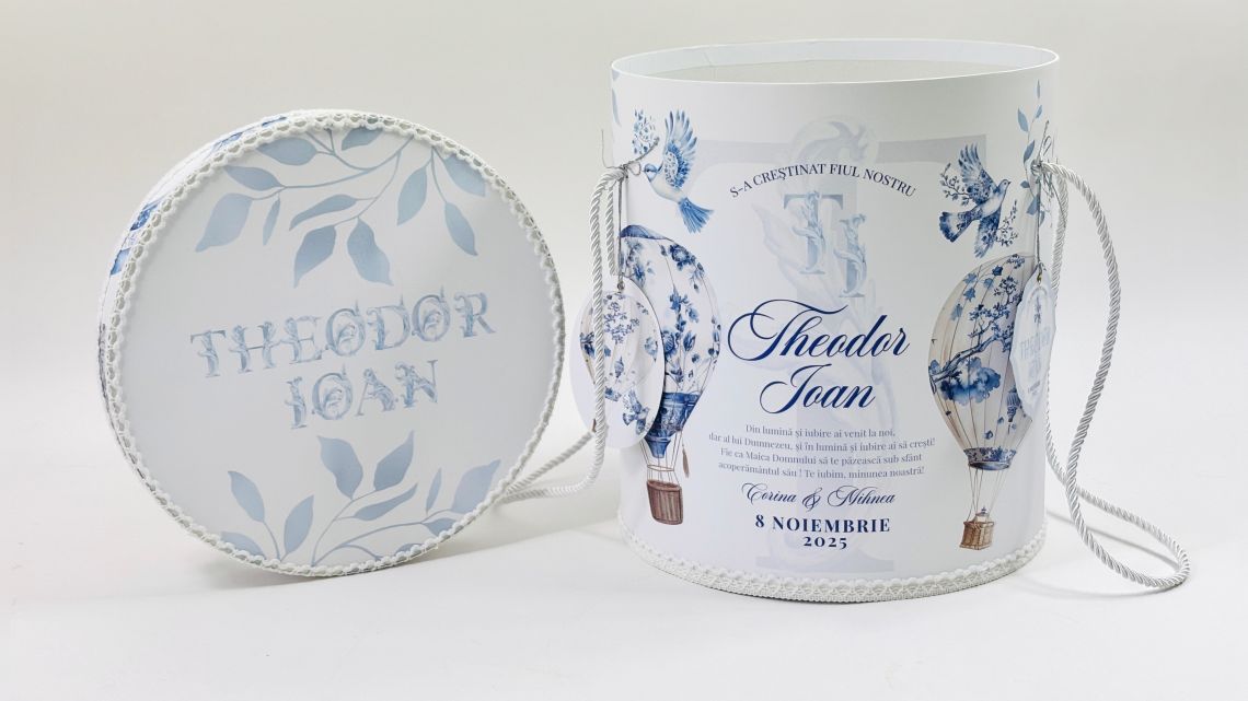 Designul cu baloane de aer cald intr-un pattern blue toile si font elegant creeaza o atmosfera sofisticata si jucausa in acelasi timp.