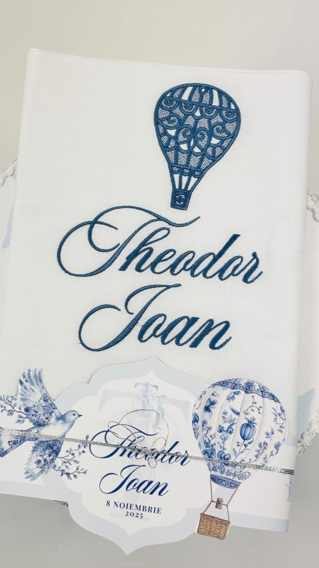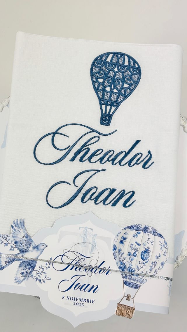 Impreuna cu modelul Hot Air Balloon Blue Toile, trusoul de botez pentru baietel aduce o nota eleganta si rafinata zilei speciale a micutului.