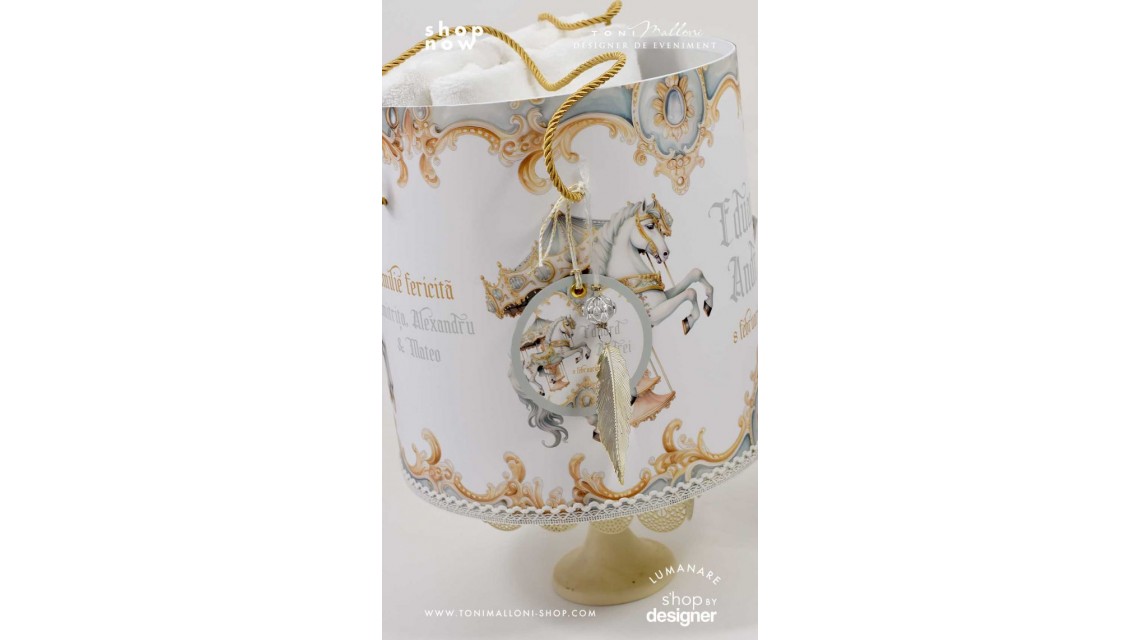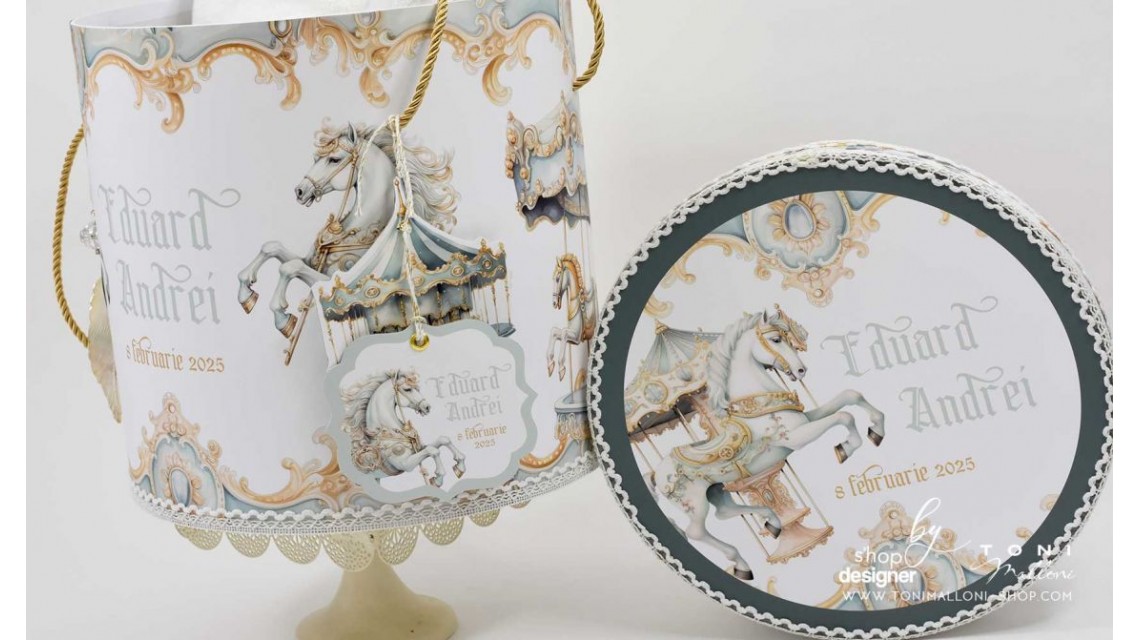 Trusou de botez băiețel inspirat din carusel vintage, în nuanțe elegante de verde, auriu și crem. Cutia decorativă este personalizată cu numele copilului și data botezului, având detalii fine cu căluți de carusel, ornamente aurii și elemente clasice. Ideal pentru un botez cu tematică rafinată, acest trusou adaugă un plus de poveste și eleganță ceremoniei de botez.Un trusou de botez cu design delicat și vesel, inspirat de magia unui carusel verde, ce aduce un aer jucăuș și nostalgic ceremoniei. Broderiile personalizate și motivele atent lucrate transformă acest set într-o alegere perfectă pentru un botez cu tematică clasică și plină de farmec.