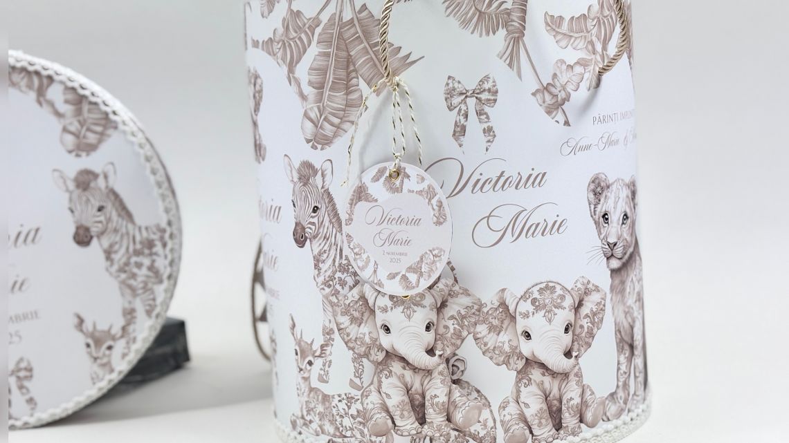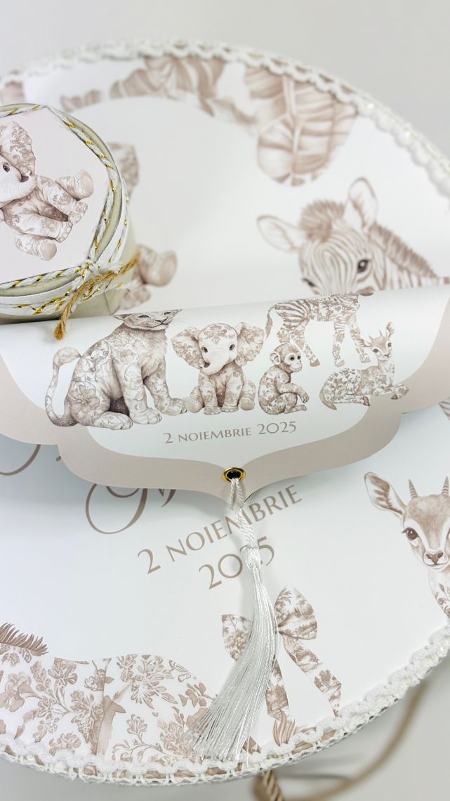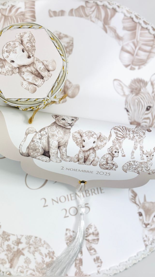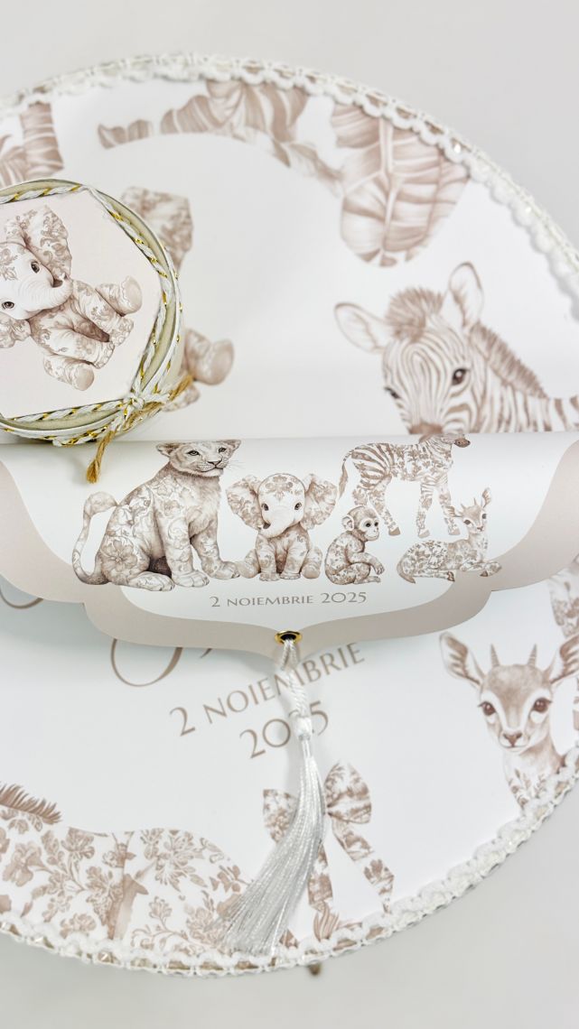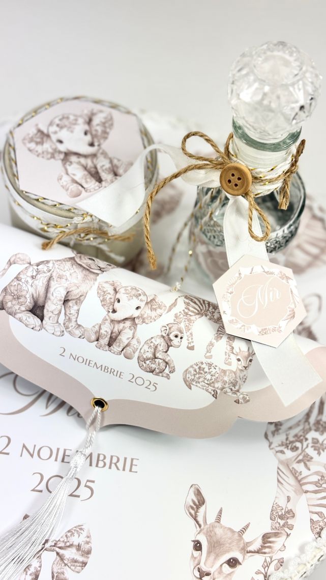 Inspirat de eleganța clasică Dior și de farmecul naturii, trusoul Dior Beige Nude Baby Safari aduce o notă modernă și rafinată momentului botezului. Nuanțele calde de nude și beige se îmbină cu detalii inspirate din lumea animalelor exotice – elefănței, girafe și leuți delicați – într-un design unisex, perfect pentru fetițe sau băieței. Fiecare element este creat cu grijă, pentru a transforma ziua botezului într-o poveste cu stil și emoție.