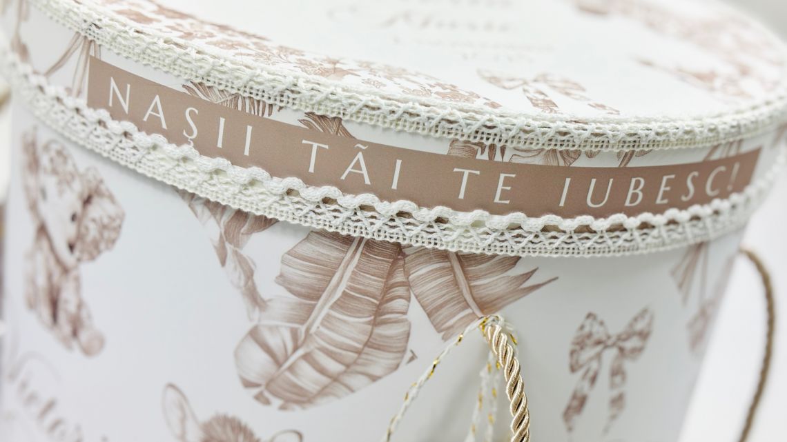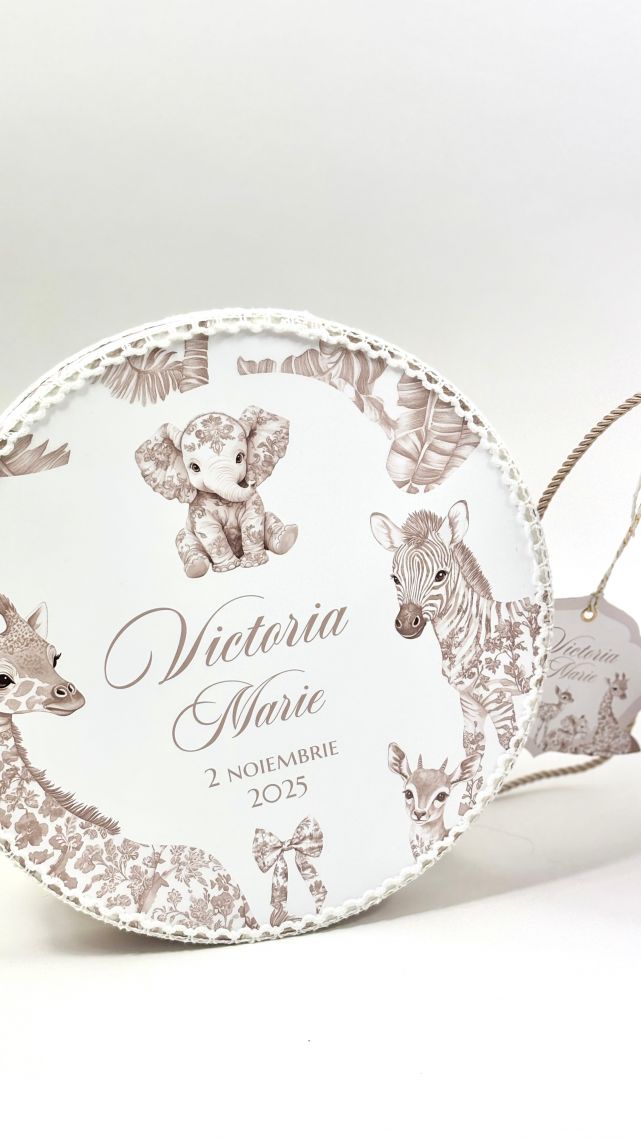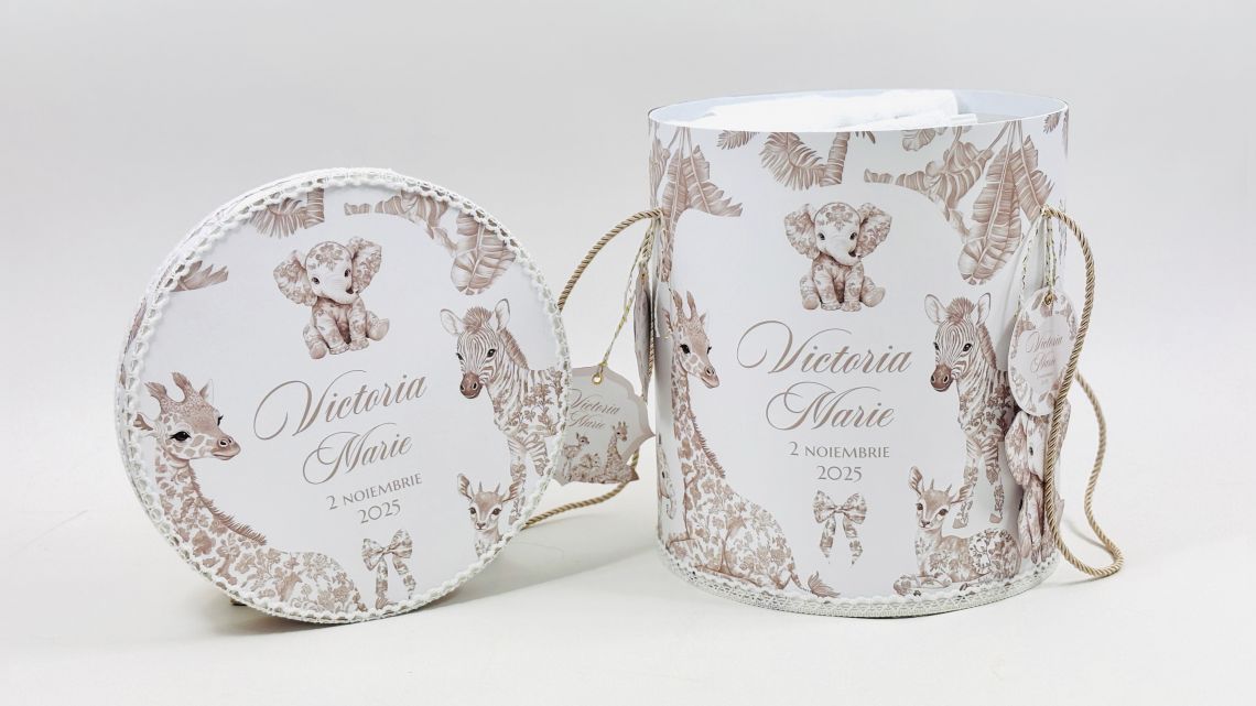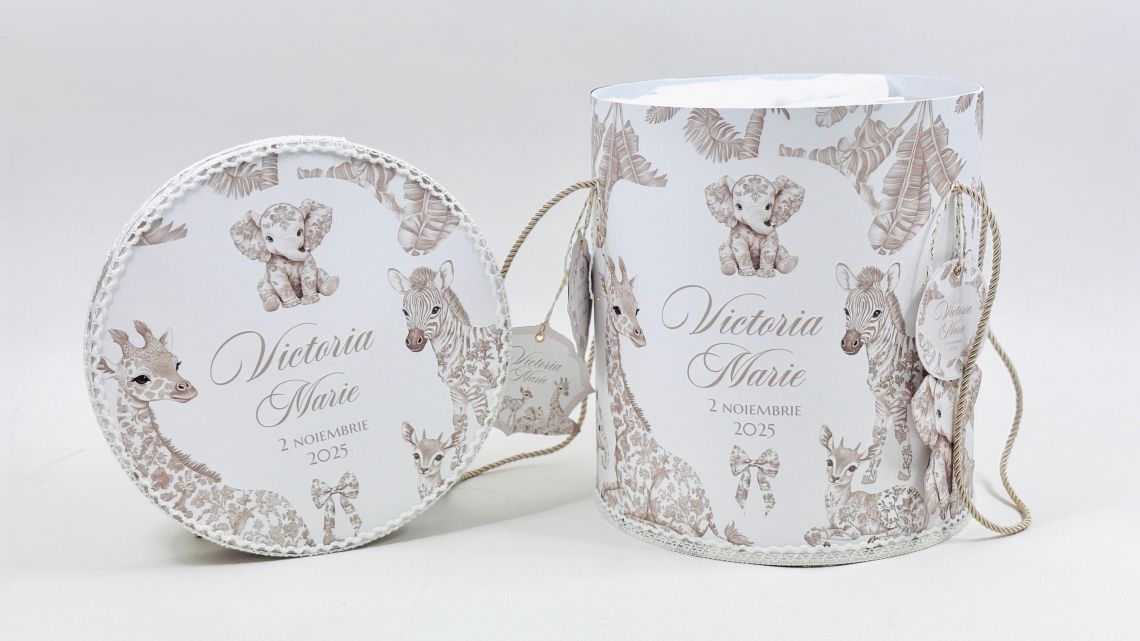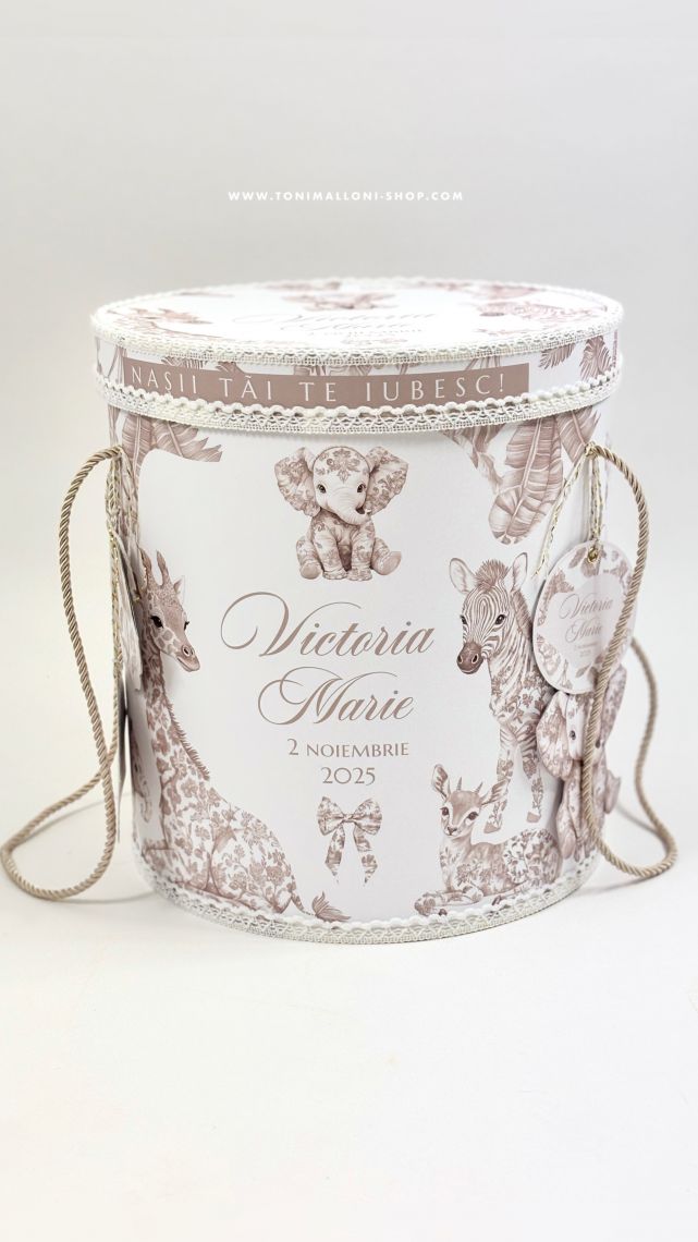 Cutie personalizată în tematica aleasă, cu dimensiuni standard: 33 cm (H) x 30 cm (D)