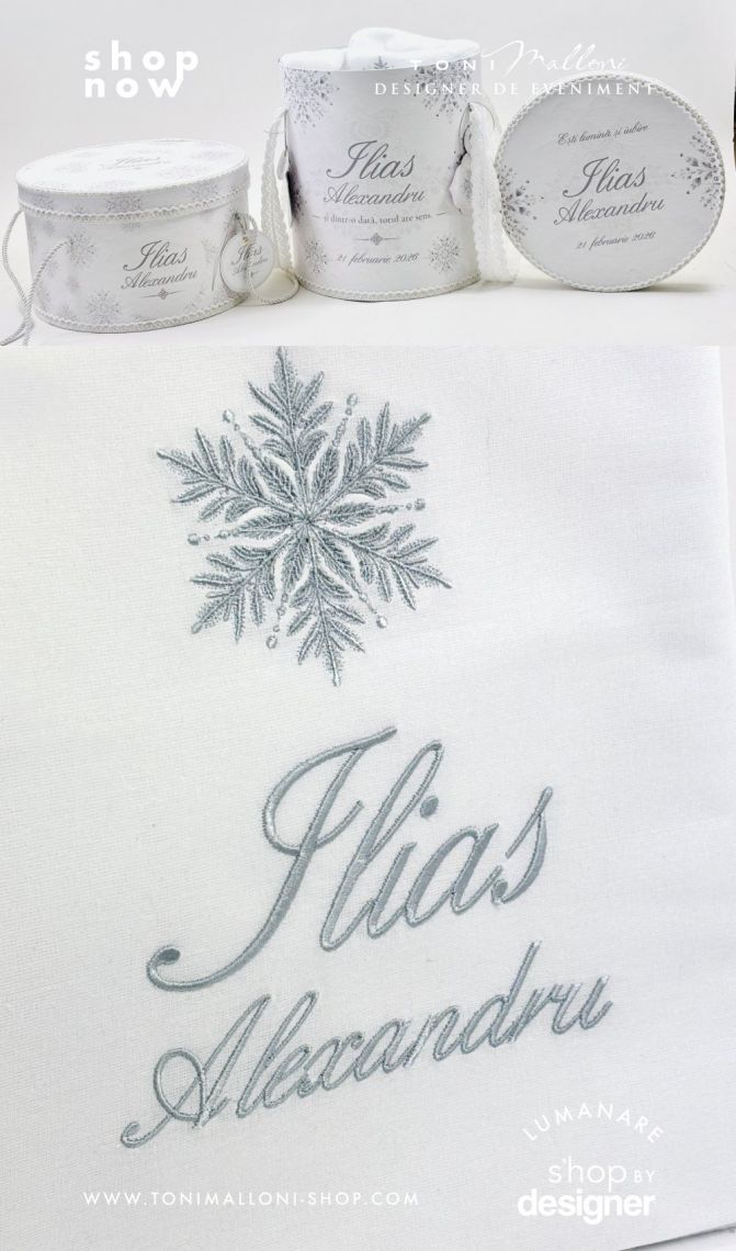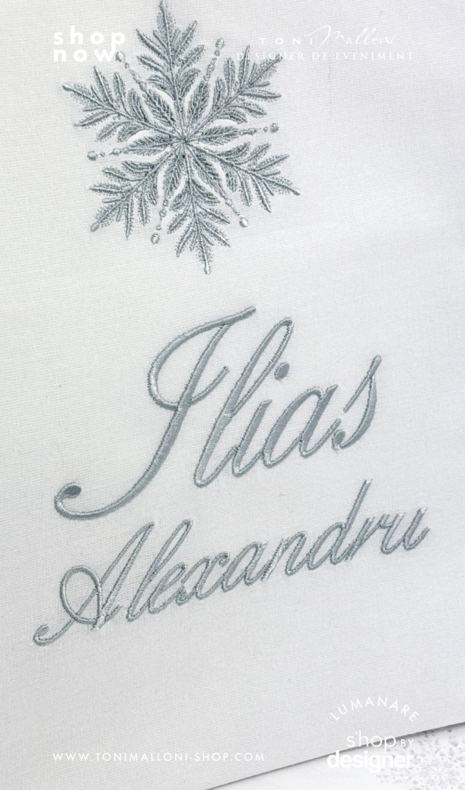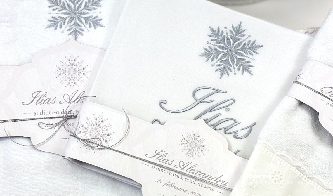 • pânză albă brodată cu numele bebelușului și fulgi de nea gri