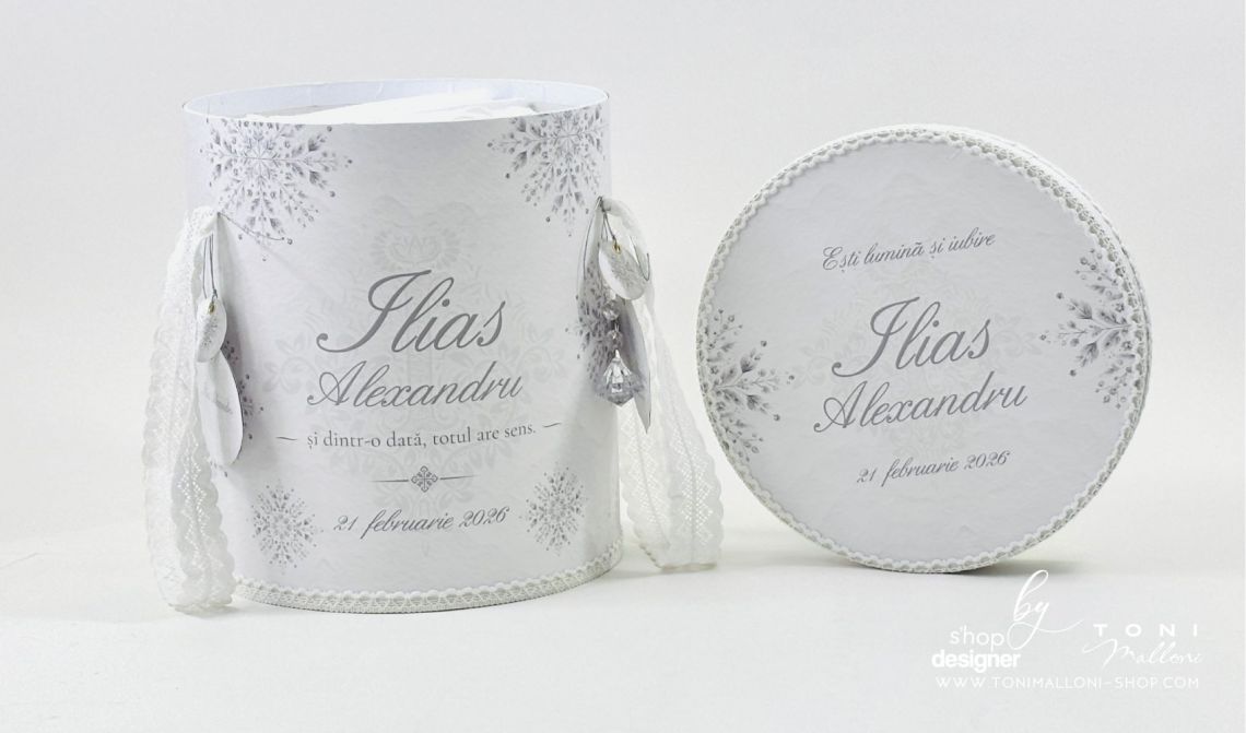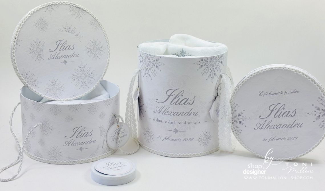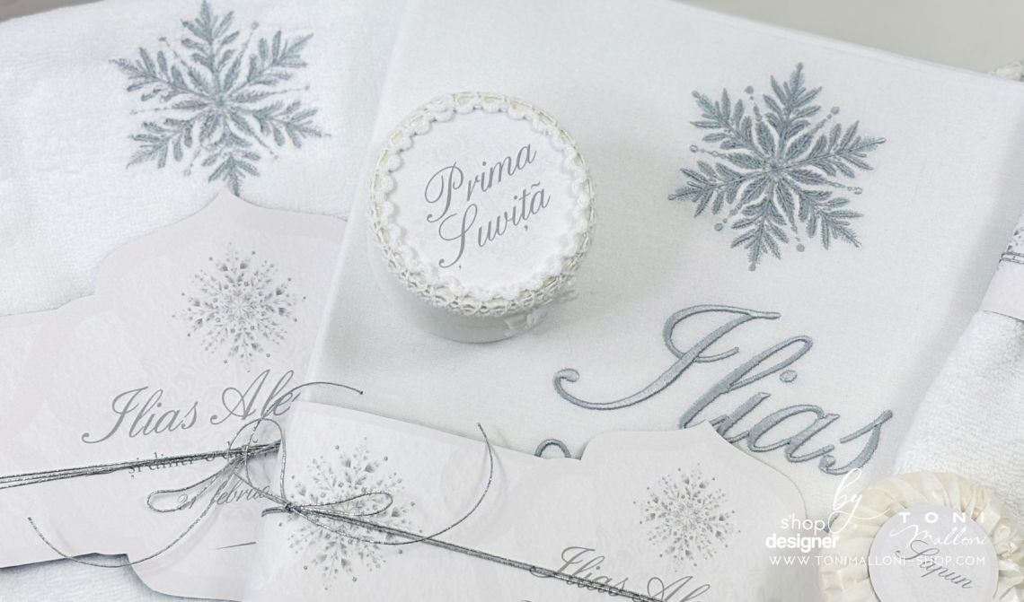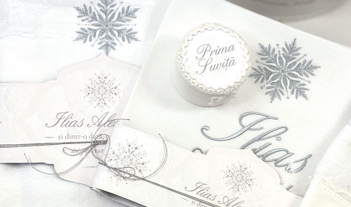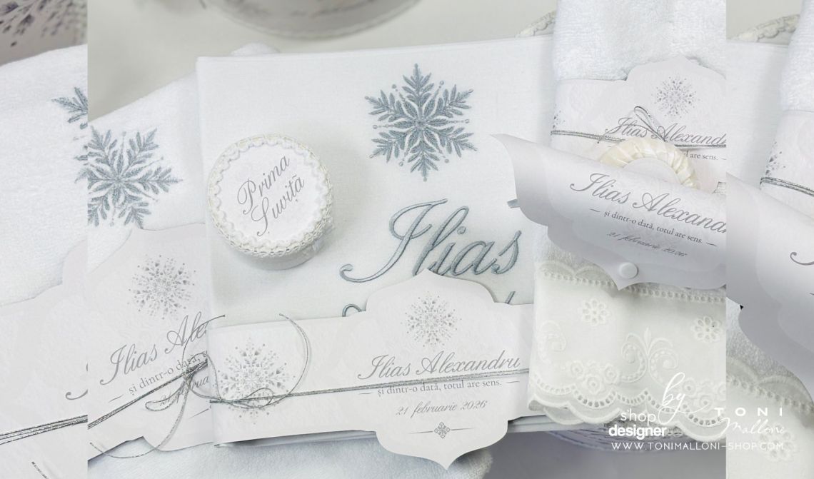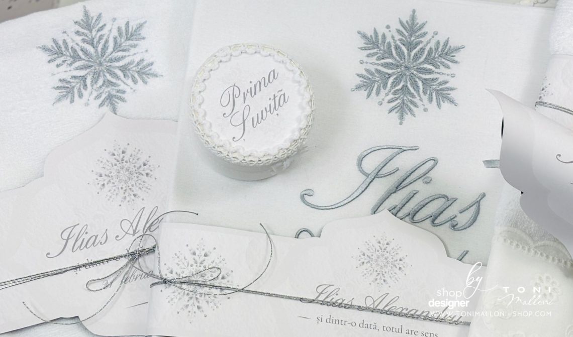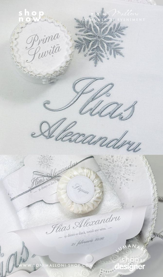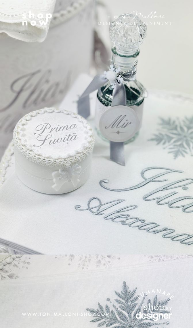 Inspirat din frumusețea liniștită a iernii, acest trusou transmite eleganță clasică și echilibru vizual, fiind potrivit pentru un eveniment solemn și memorabil. Broderia personalizată cu numele bebelușului completează armonios designul și transformă fiecare piesă într-o amintire unică.