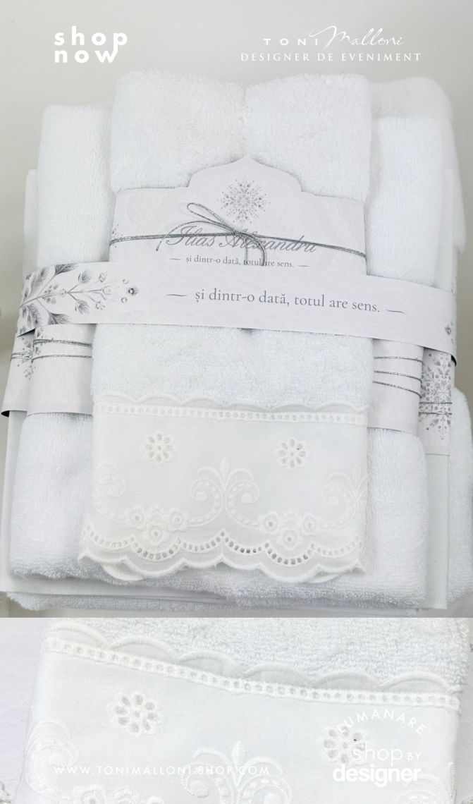 Pentru un plus de rafinament și un aspect spectaculos, prosoapele pot fi accesorizate cu dantelă decorativă din bumbac, aplicată cu atenție la detalii, pentru a completa armonios designul elegant al trusoului. Acest detaliu transformă setul într-o variantă premium, cu un aspect bogat și festiv, potrivit pentru un eveniment cu adevărat special.