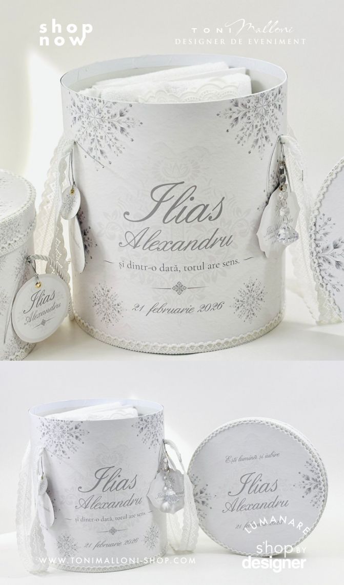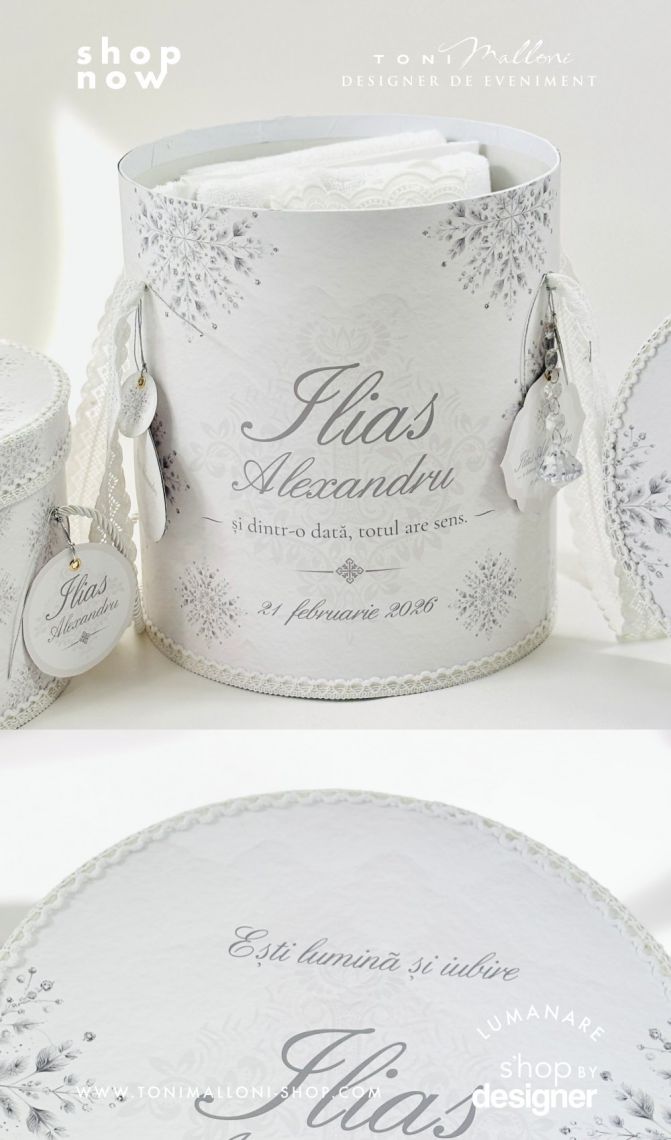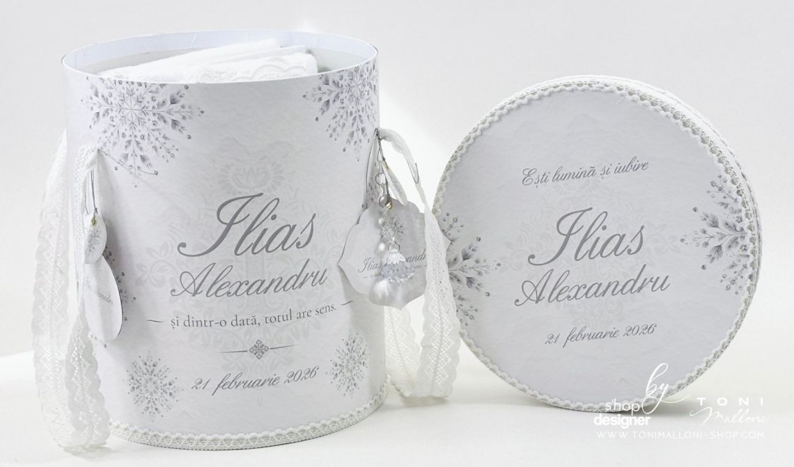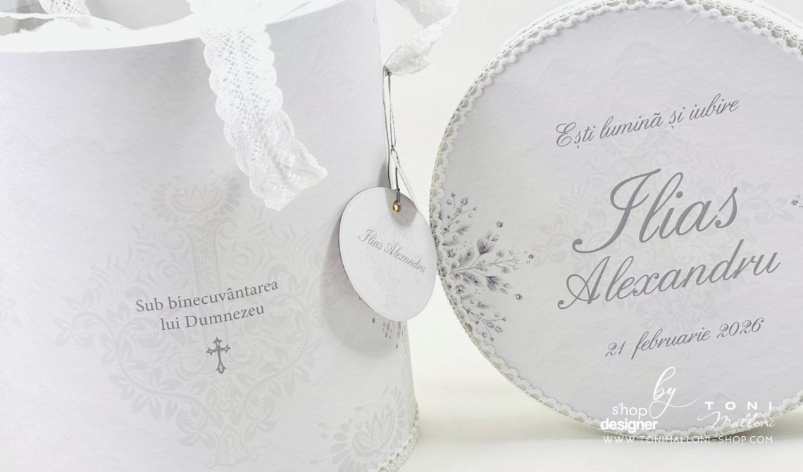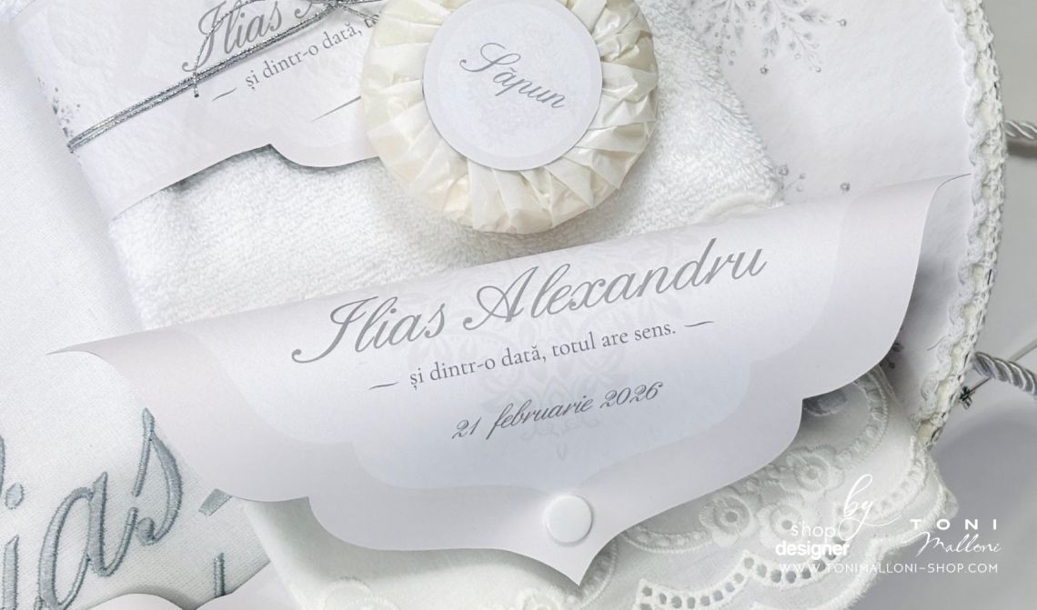 Un set complet, elegant, cu piese utile pentru ceremonia botezului, dar și pentru păstrarea amintirilor.