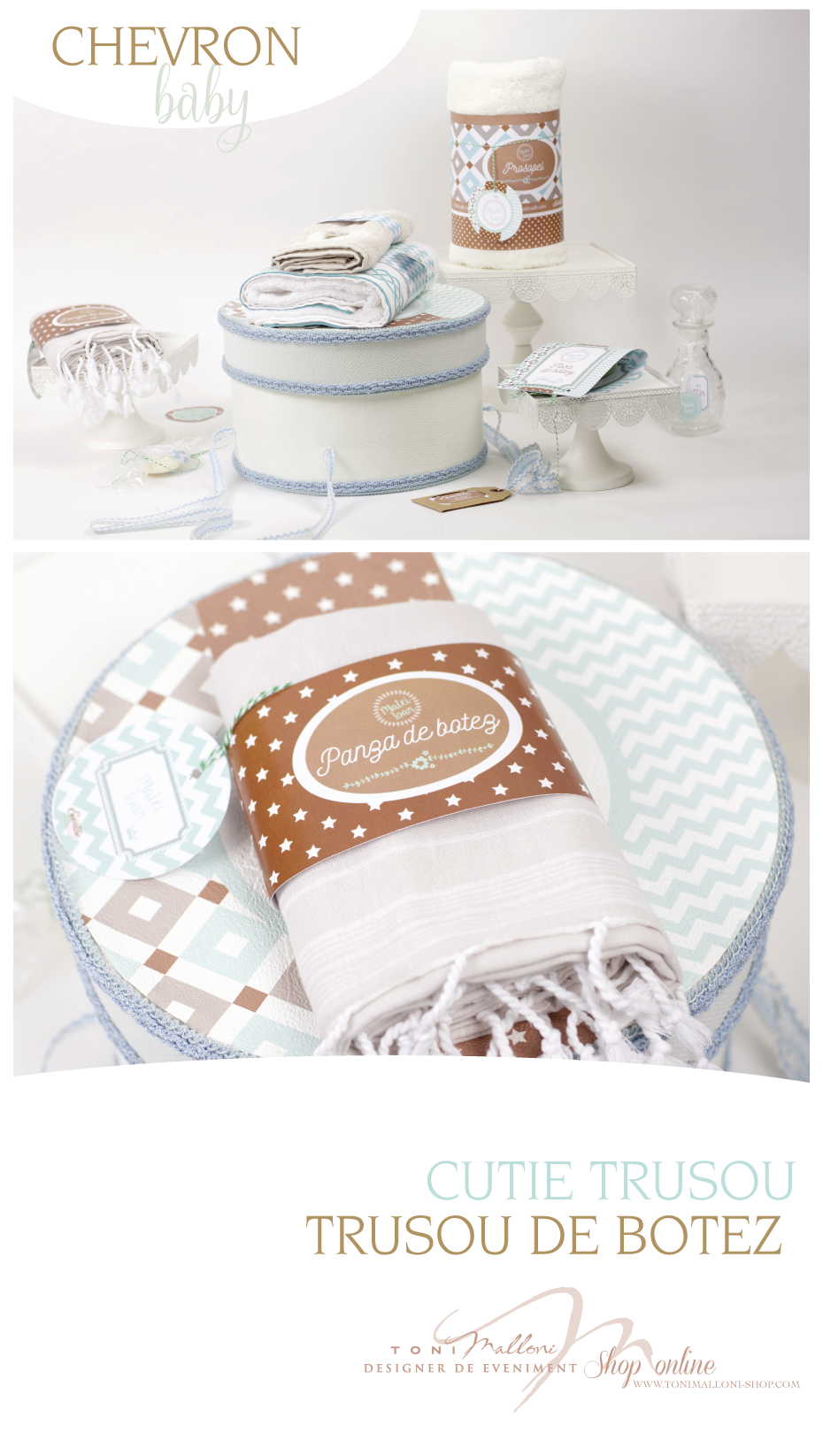 Trusoul „Chevron” impresionează prin designul său modern și vesel, combinând dungi elegante cu nuanțe fresh de turcoaz, ideal pentru botezul băiețelului tău. Acest set atrage prin simplitate și prospețime, aducând un aer contemporan și plin de stil.