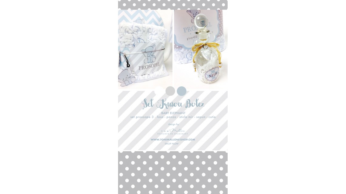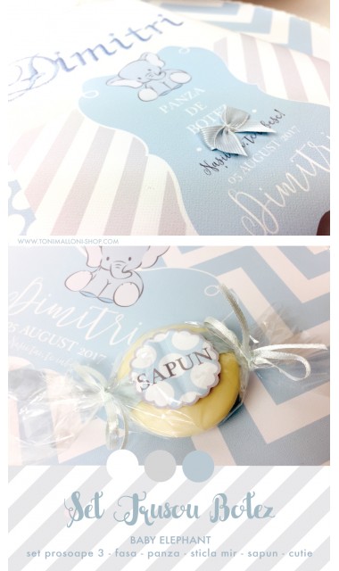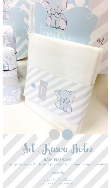 Trusoul „Bleu & Grey Elephant” combină delicatețea nuanțelor de albastru și gri cu un design jucăuș, având ca simbol central un elefănțel drăgălaș, perfect pentru botezul băiețelului tău. Broderiile atent realizate adaugă un plus de personalizare și rafinament, transformând setul într-o amintire de neuitat.
