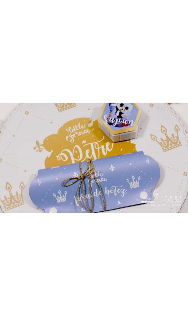 Cutia trusoului este lucrată în tematica regală a setului, cu dimensiuni ideale pentru toate accesoriile necesare botezului, devenind ulterior un spațiu elegant pentru păstrarea amintirilor prețioase.