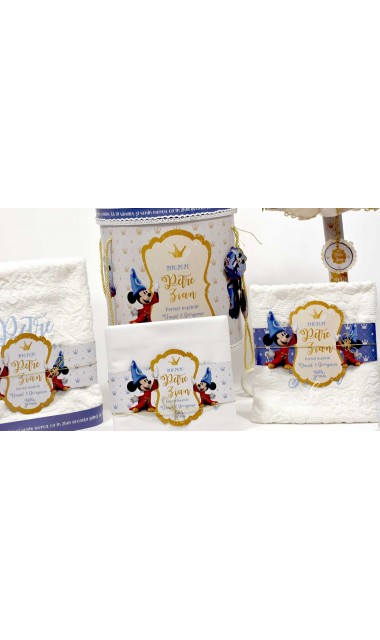 • pânză albă brodată cu numele bebelușului și motive Disney Mickey Mouse