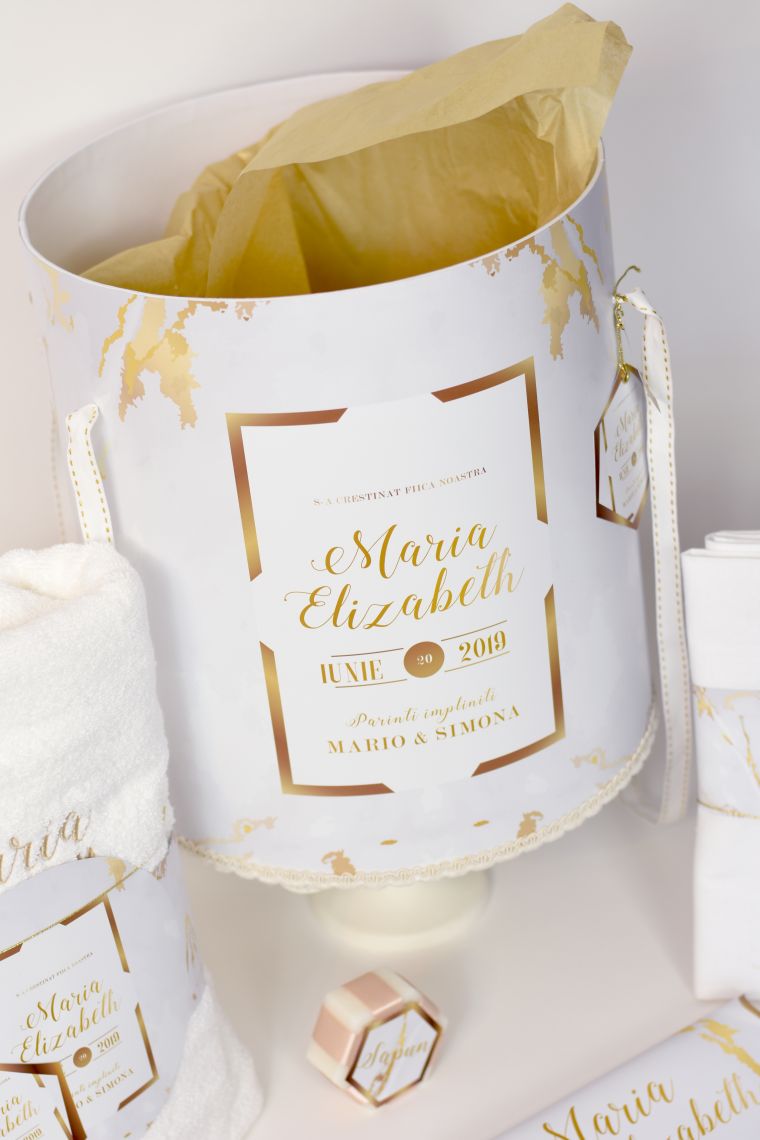 – cutie rotundă pentru trusou, decorată în tematica alb și gold, cu un design elegant și modern