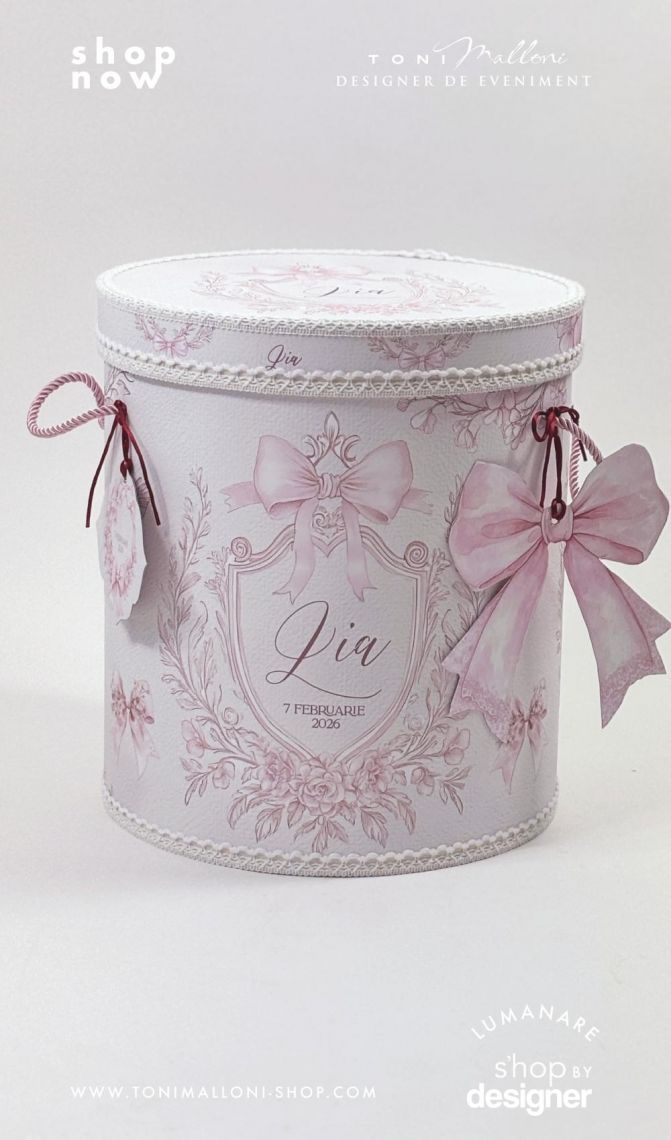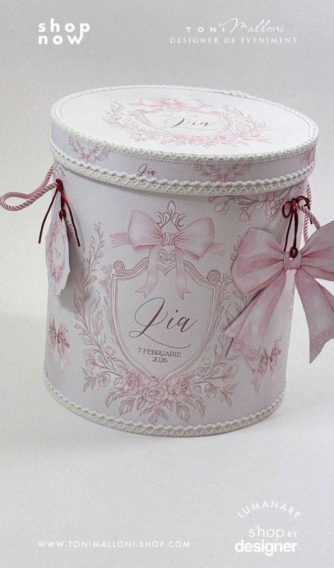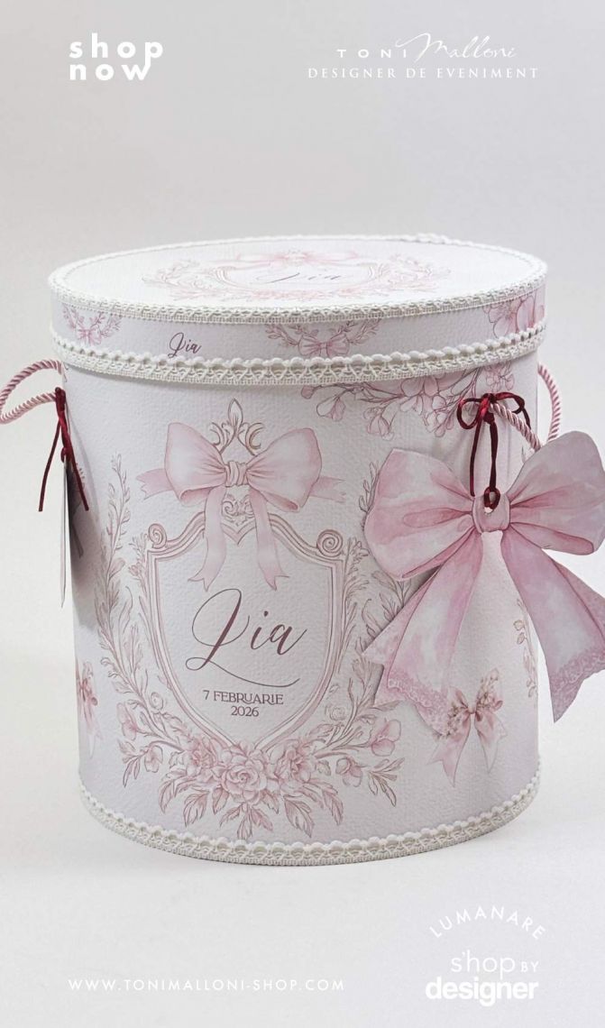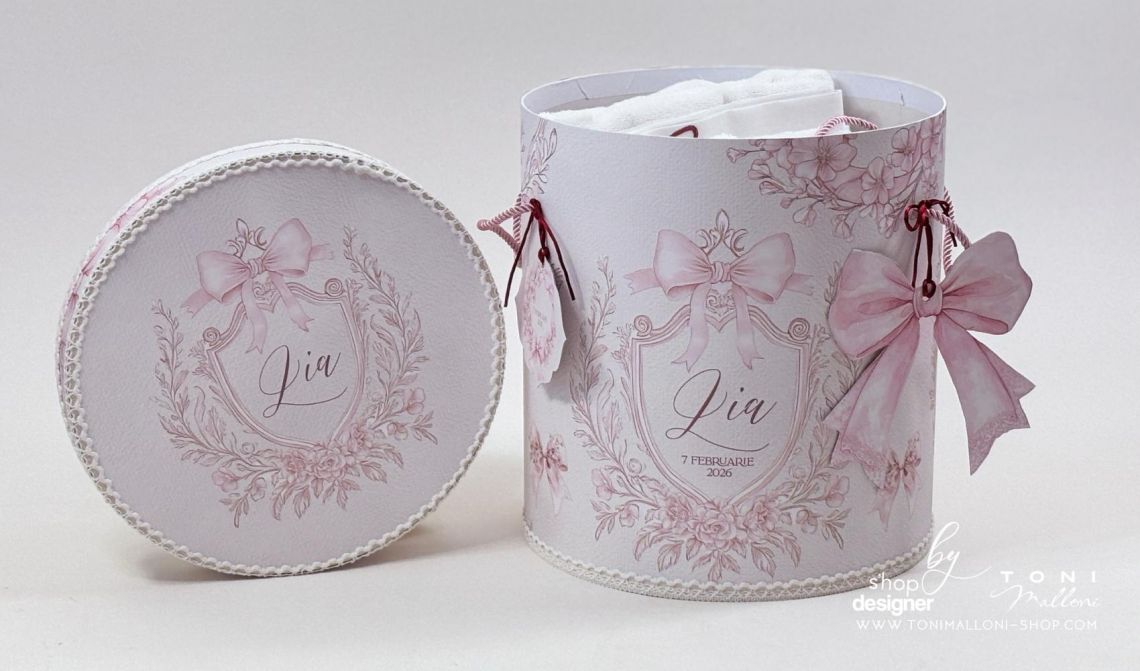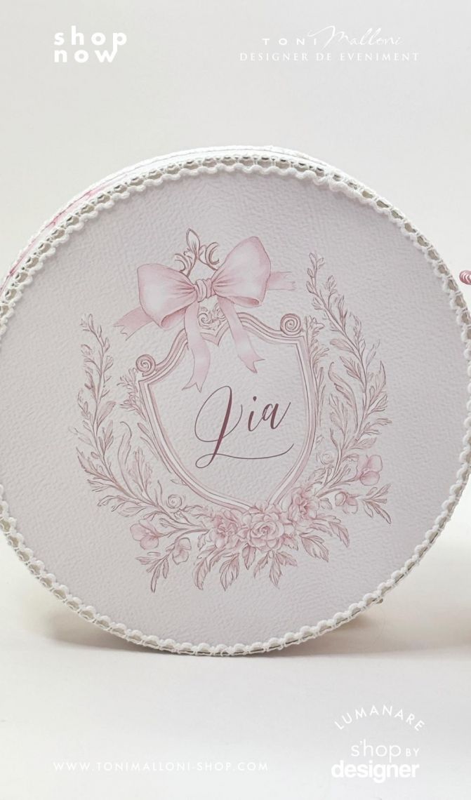 – cutie rotundă pentru trusou, îmbrăcată în material cu frame floral și fundițe roz, perfectă pentru păstrarea amintirilor din ziua botezului