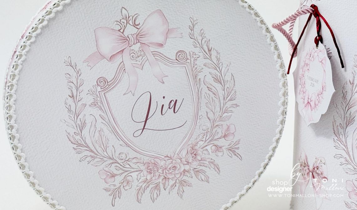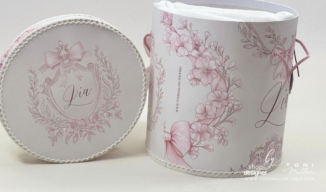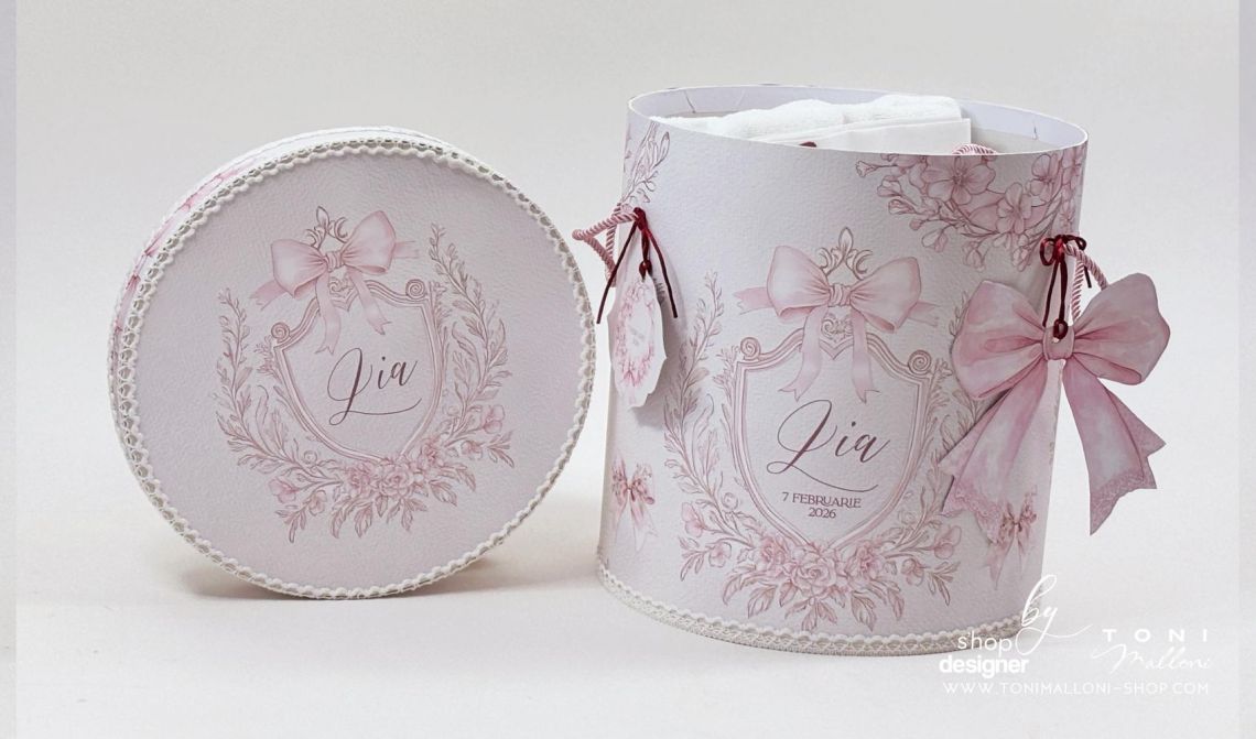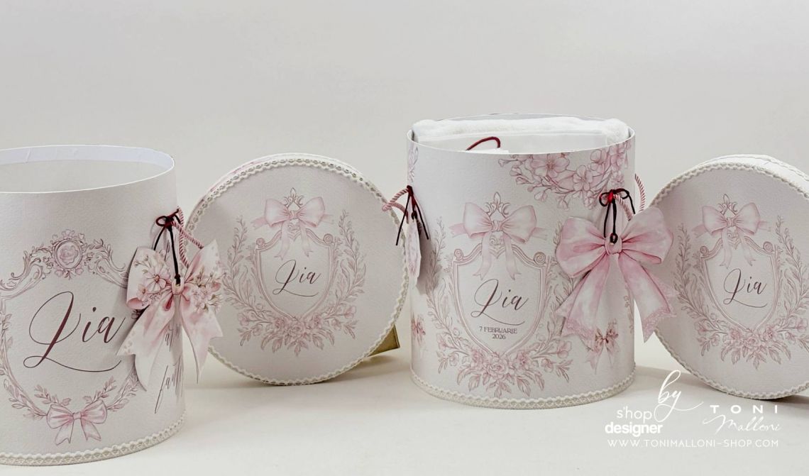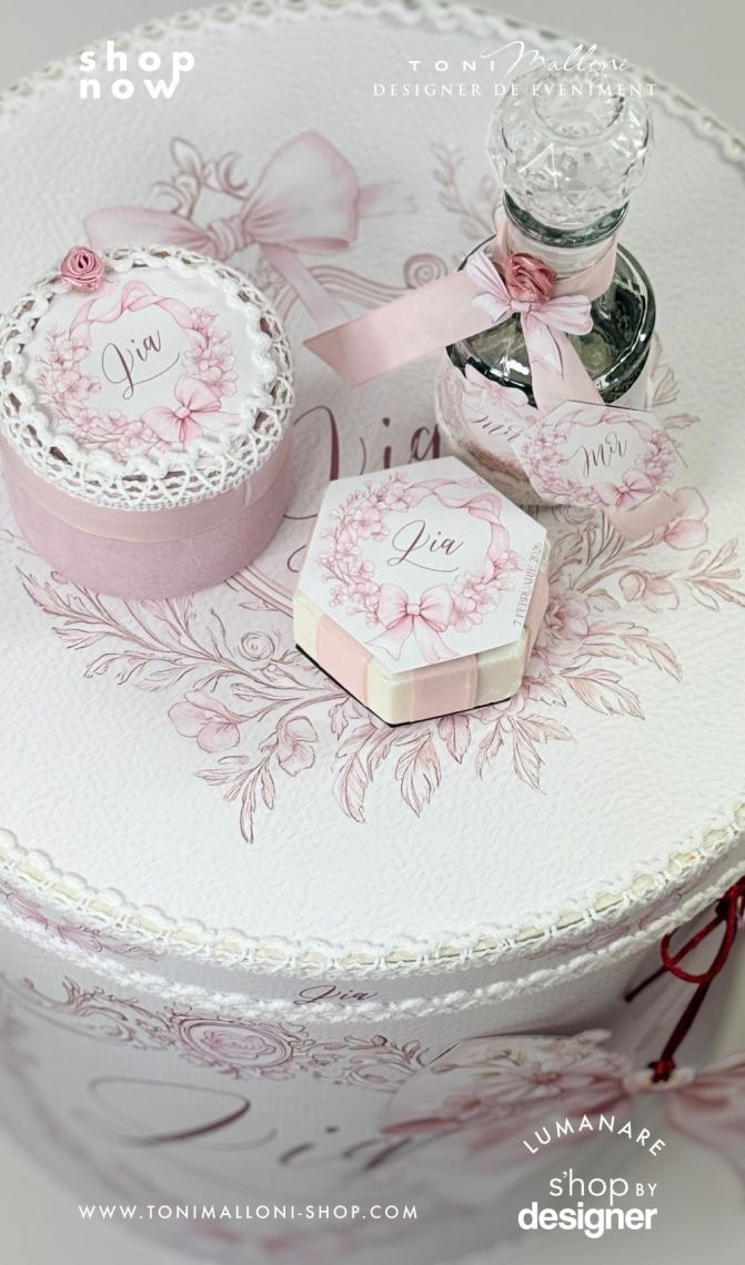 – cutie rotundă pentru trusou, îmbrăcată în material cu frame floral și fundițe roz, perfectă pentru păstrarea amintirilor din ziua botezului