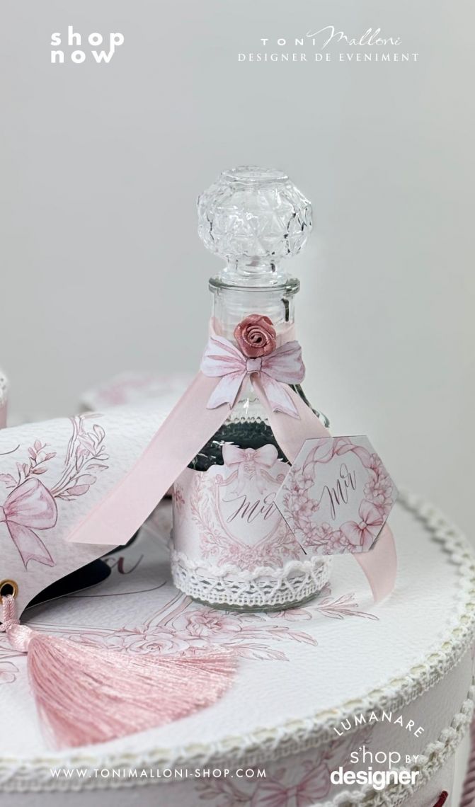 – sticluță pentru mir decorată manual, în tonuri delicate de roz și grena