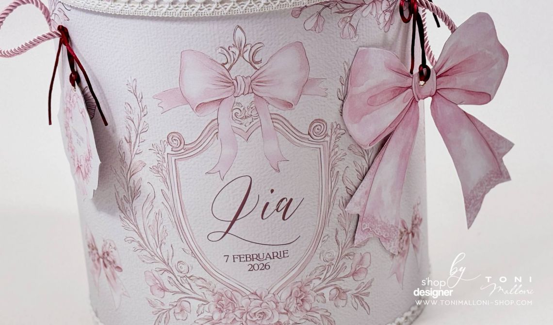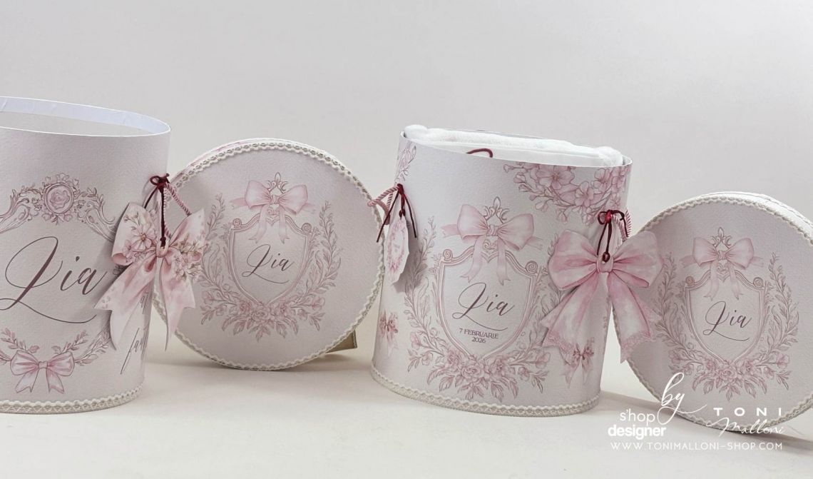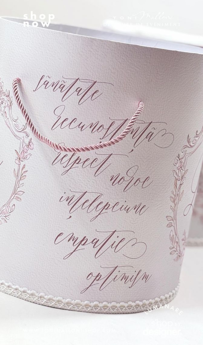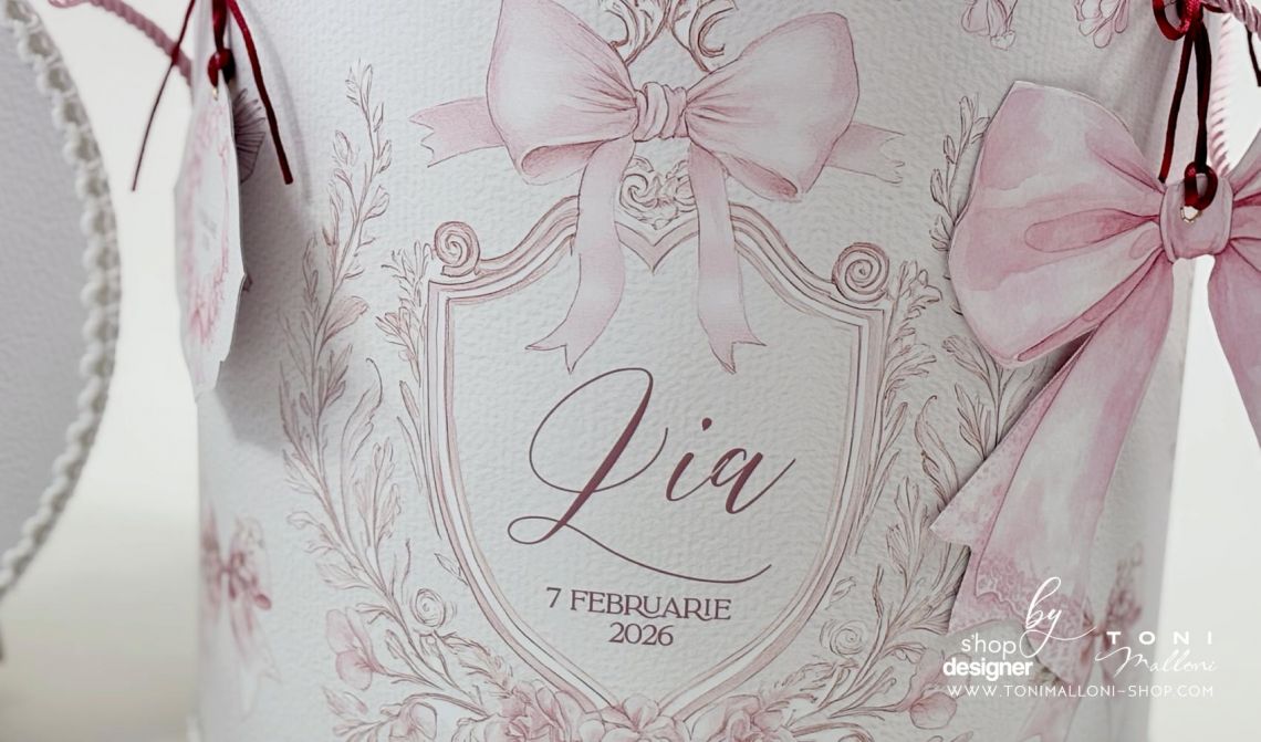 Nuanțele suave de alb murdar și roz pudră sunt completate de accente profunde de grena/burgundy, iar frame-ul floral vintage antichizat, împodobit cu fundițe roz și flori delicate, creează o atmosferă romantică și rafinată.
