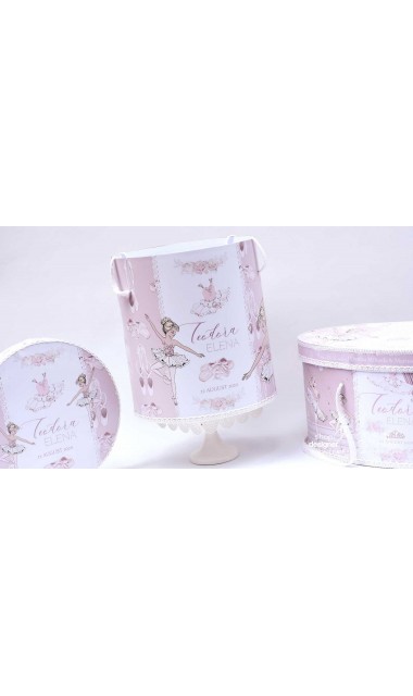 – cutie rotundă pentru trusou, decorată cu motive balerinești și accente elegante