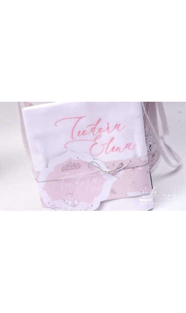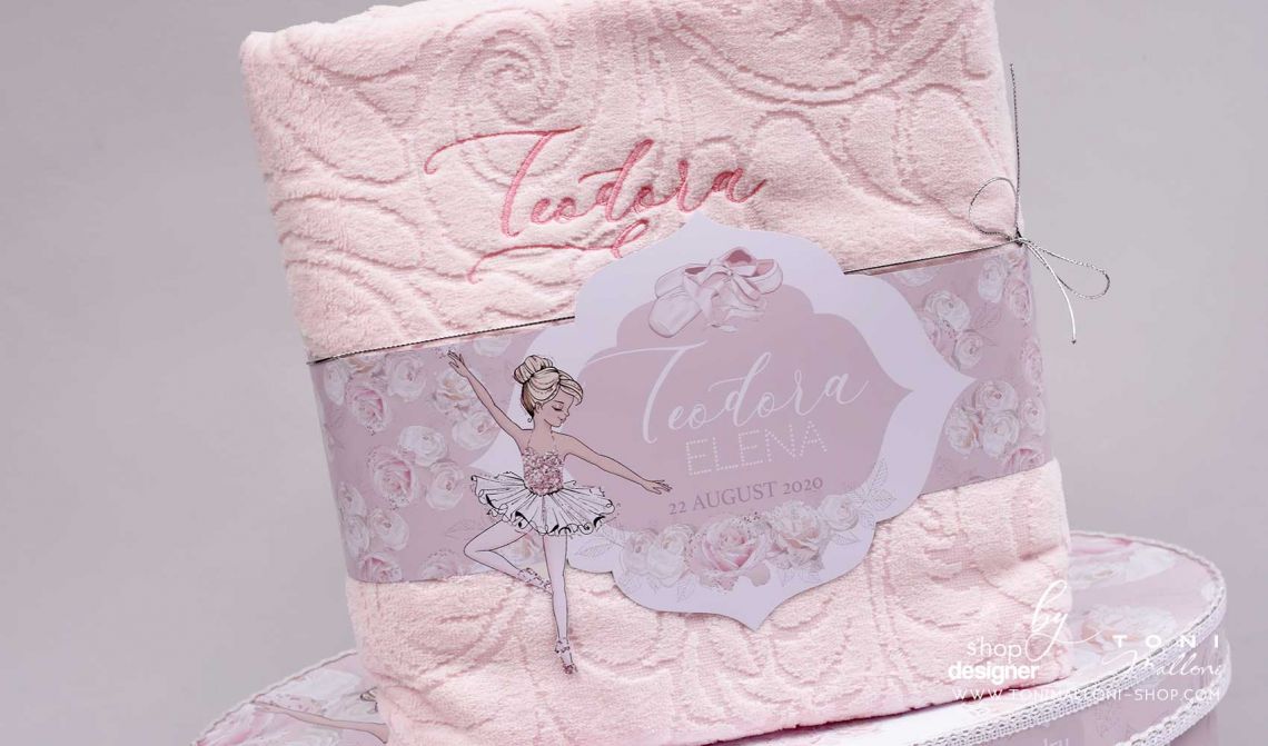 Trusoul de botez „Mica Balerină” aduce grație și eleganță printr-un design delicat inspirat de lumea baletului. Decorat cu motive de tutu, tiară și detalii fine brodate manual, acest trusou personalizat emană feminitate și rafinament, fiind perfect pentru fetița ta într-o zi cu totul specială. Broderia personalizată cu numele și data botezului completează armonios această creație plină de farmec.
